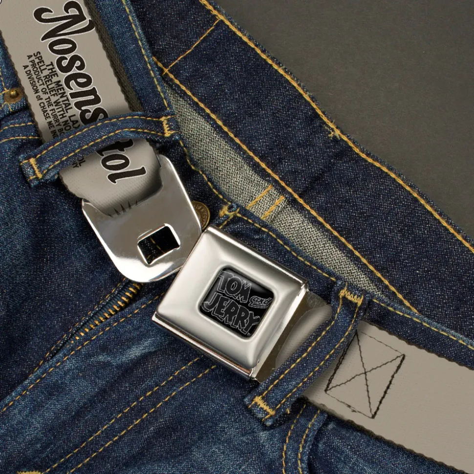 Tom and Jerry Logo Full Color Black Red Seatbelt Belt – Tom & Jerry NOSENATOL THE MENTAL LAXATIVE Grays/White/Black Webbing