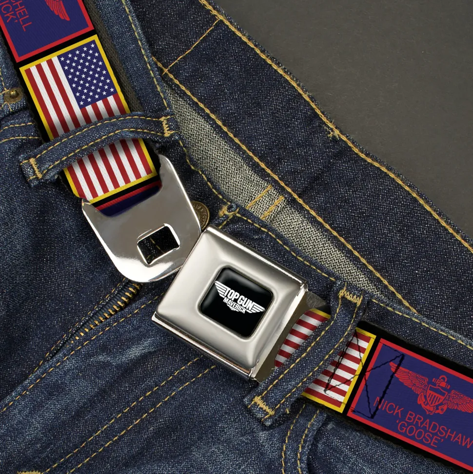 TOP GUN Title Logo Full Color Black/White Seatbelt Belt – Top Gun Maverick Goose and American Flag Patch Blocks Black Webbing