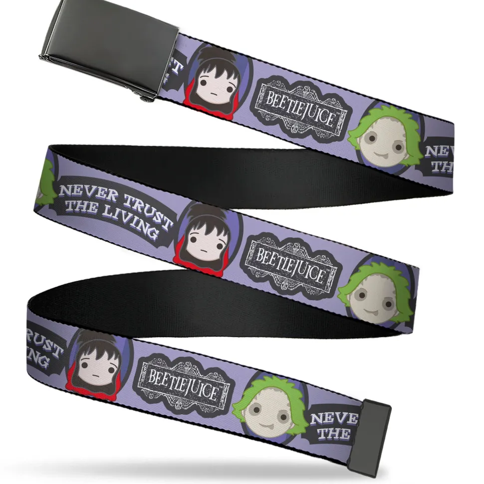 This unique web belt features a solid plain military-style clasp Buckle. It features beautiful artwork which is dyed into the fabric to ensure it looks great for years. This belt is available in 1.0″, 1.25″, and 1.5″ widths. 1.0″ wide belt is sized for children and adults with pants size 30 or lower. 1.25″ and 1.5″ wide belts are sized for adults, fitting up to pant size 42. This web belt is made from high-density nylon and steel. 1.5″ wide belt also has a bottle opener built into the back of the buckle! This product is Made in the USA by Buckle-Down Inc. and is officially licensed by Warner Bros. Horror Movies.