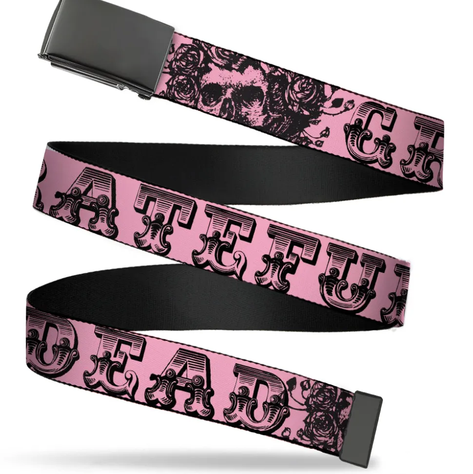This unique web belt features a solid plain military-style clasp Buckle. It features beautiful artwork which is dyed into the fabric to ensure it looks great for years. This belt is available in 1.0″, 1.25″, and 1.5″ widths. 1.0″ wide belt is sized for children and adults with pants size 30 or lower. 1.25″ and 1.5″ wide belts are sized for adults, fitting up to pant size 42. This web belt is made from high-density nylon and steel. 1.5″ wide belt also has a bottle opener built into the back of the buckle! This product is Made in the USA by Buckle-Down Inc. and is officially licensed by Grateful Dead.