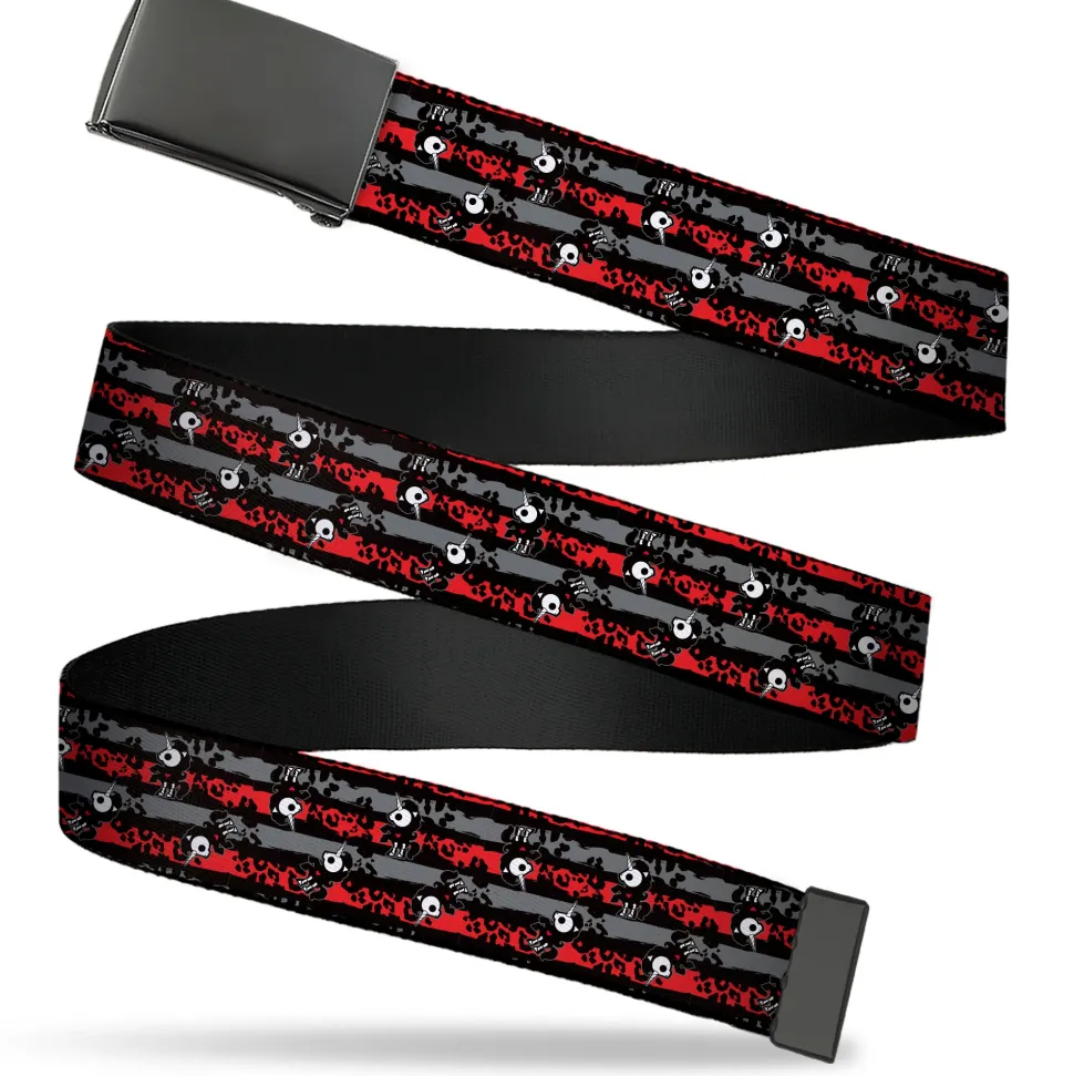 Web Belt Blank Black Buckle - Skelanimals Bonita the Unicorn Poses Stripe Black/Red/Gray Webbing