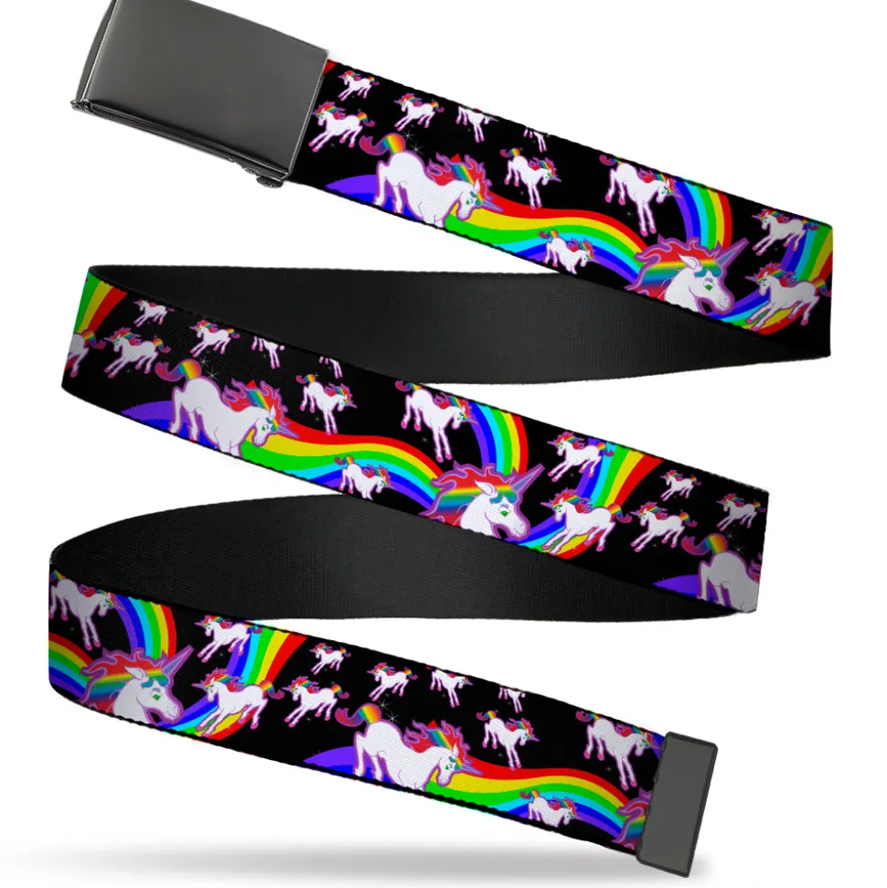 Web Belt Blank Black Buckle – Unicorns/Rainbow Swirl Black Webbing