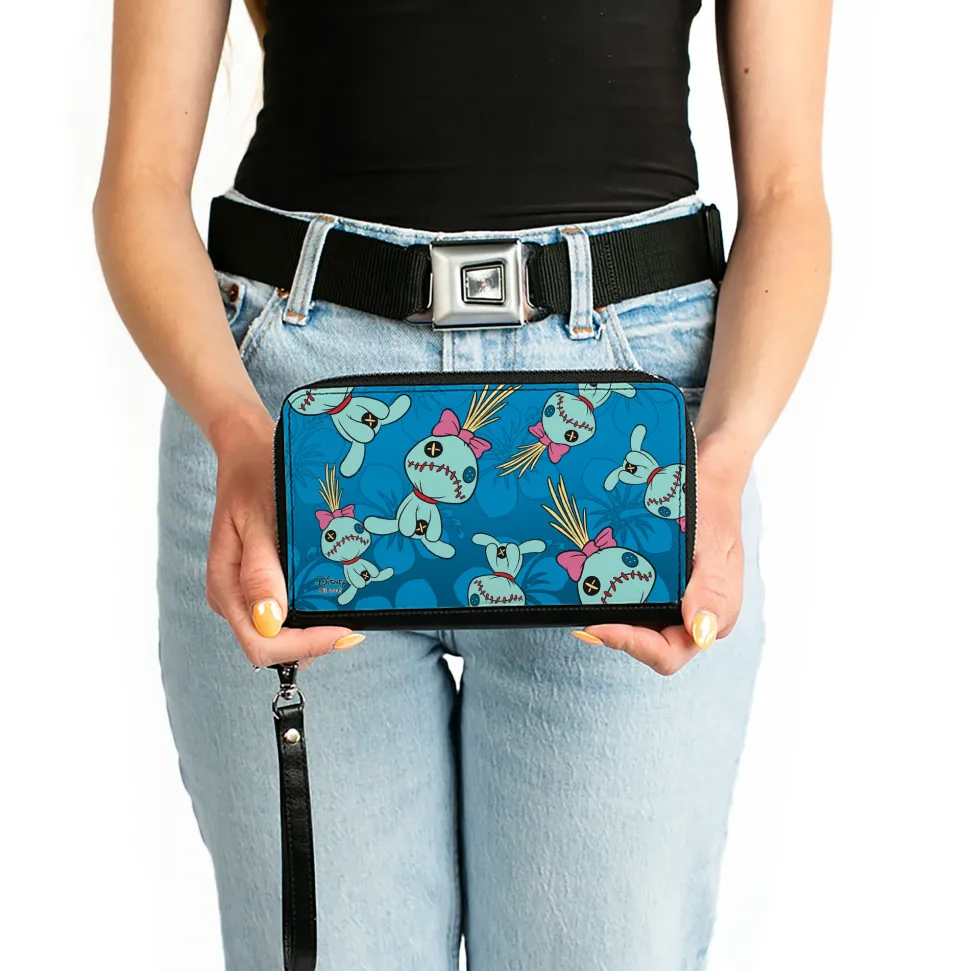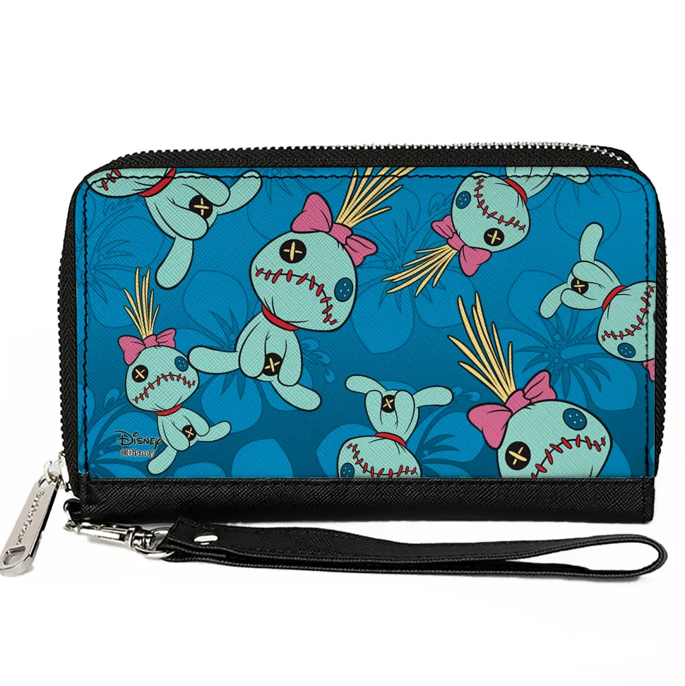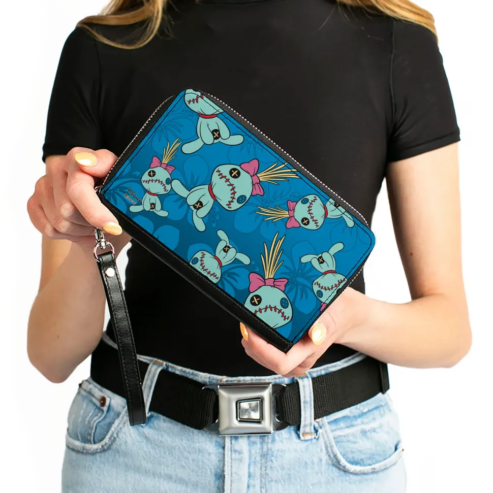 Women's PU Zip Around Wallet Rectangle - Lilo & Stitch Scrump Pose Hibiscus Flowers Scattered Blues