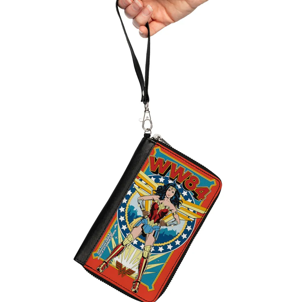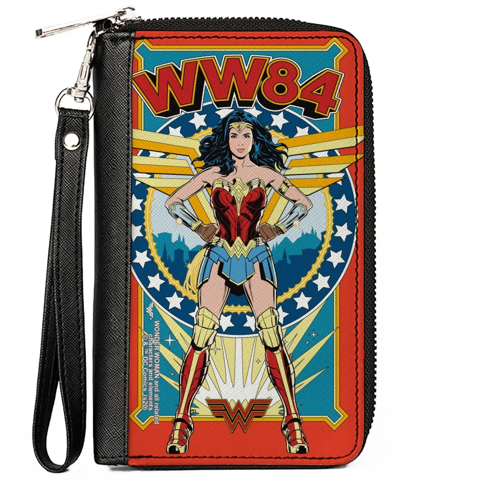 Women's PU Zip Around Wallet Rectangle - Wonder Woman WW84 Standing Pose Stars Reds Yellows Blues
