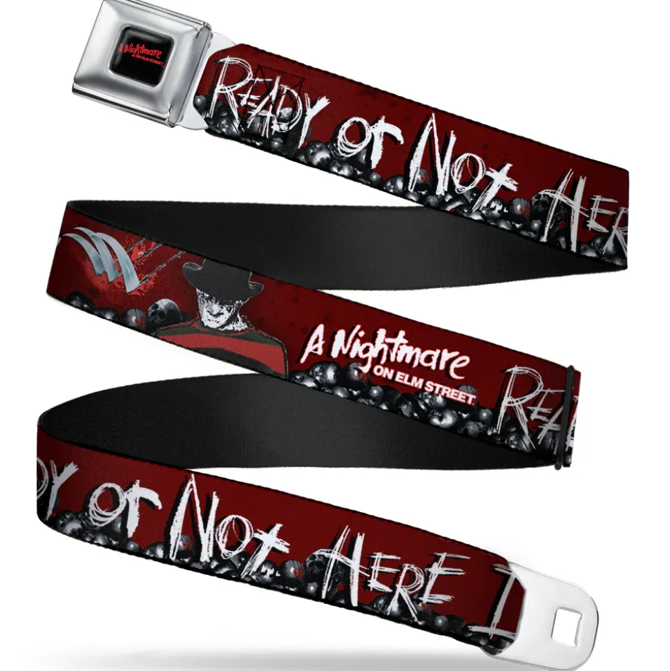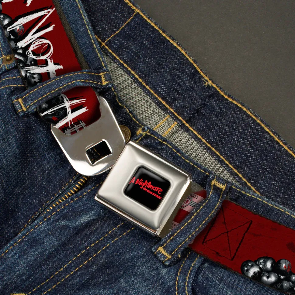 A NIGHTMARE ON ELM STREET Full Color Black/Blood Splatter Reds Seatbelt Belt – A NIGHTMARE ON ELM STREET/READY OR NOT HERE I COME/Freddy Pose/Skulls Reds/Black/Grays/White Webbing