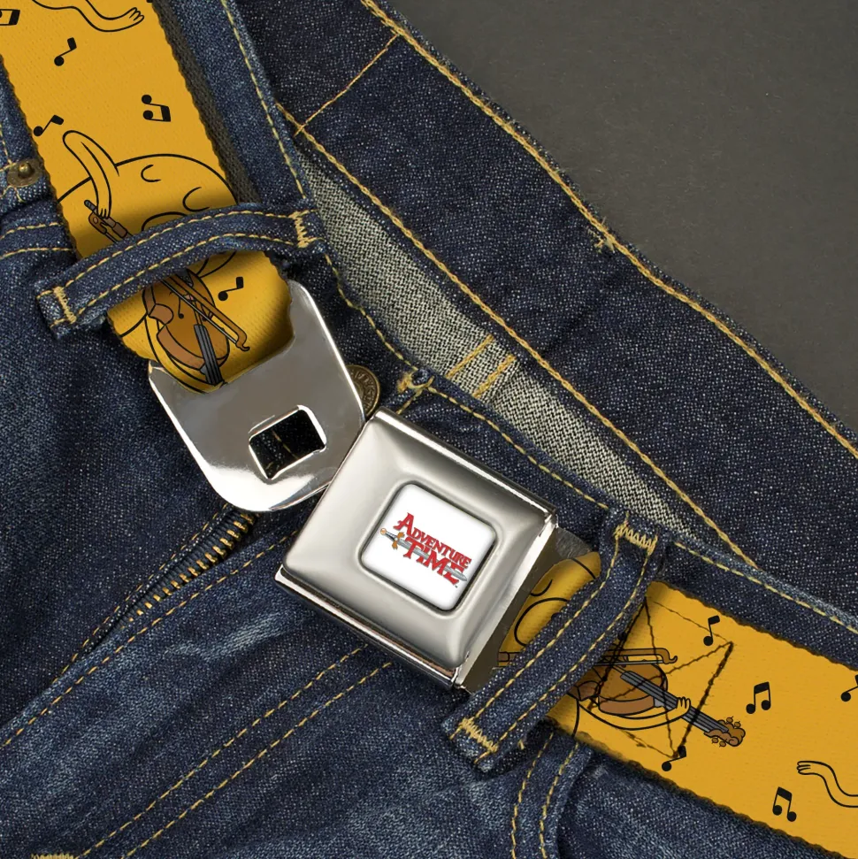 ADVENTURE TIME Title Logo Full Color White Seatbelt Belt – Adventure Time Jake Dancing and Violin Poses Yellow Webbing