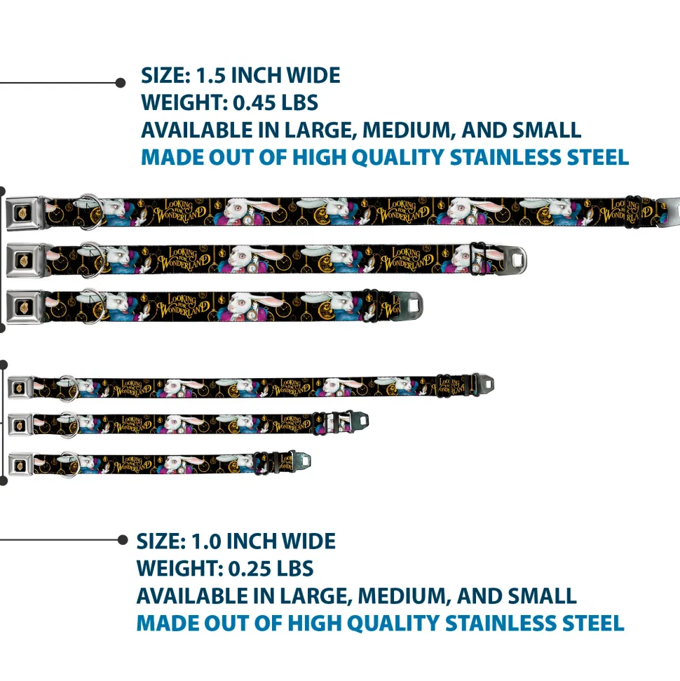 Alice in Wonderland Clock Full Color Black/Gold/White Seatbelt Buckle Collar – White Rabbit Poses LOOKING FOR WONDERLAND/Clocks Black/Golds