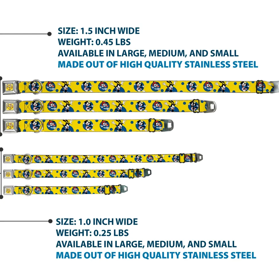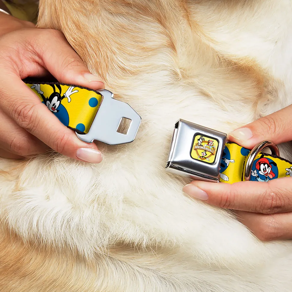 Your dog will be the talk of the town when people notice they’re wearing this awesome SeatBelt Dog Collar! Made from high-density polyester and durable steel components, this collar is built to last. It features beautiful vibrant artwork. The buckle is a miniature authentic SeatBelt Buckle, so you press the center button to release the clasp. This product is Made in USA by Buckle-Down Inc. and officially licensed by Animaniacs.