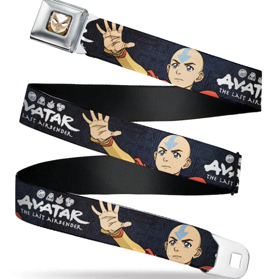 Avatar the Last Airbender Aang Face Close-Up Full Color Seatbelt Belt – AVATAR THE LAST AIRBENDER Aang Hand Pose and Title Logo Black/Grays Webbing
