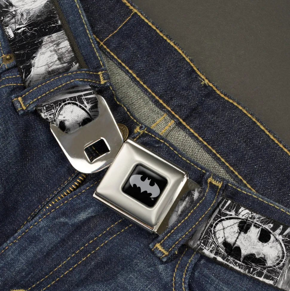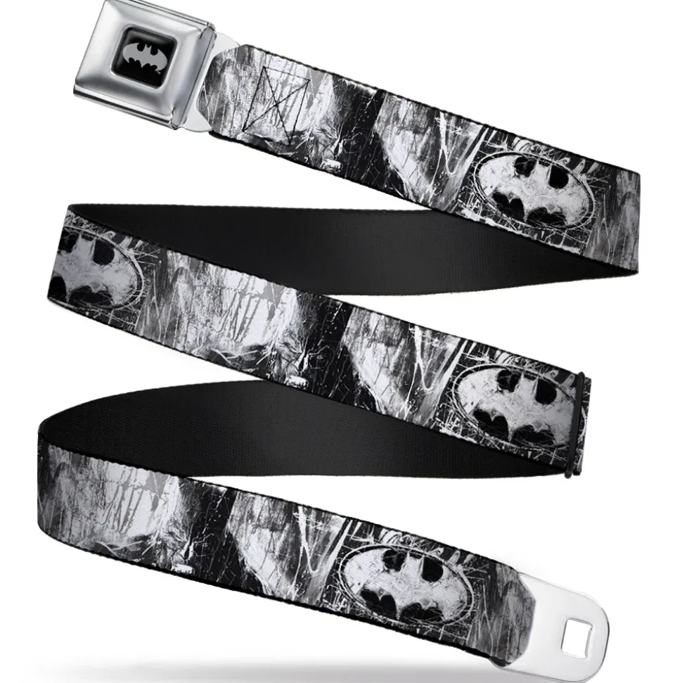 Batman Black Silver Seatbelt Belt – Batman Face/Bat Shield Sketch White/Black Webbing