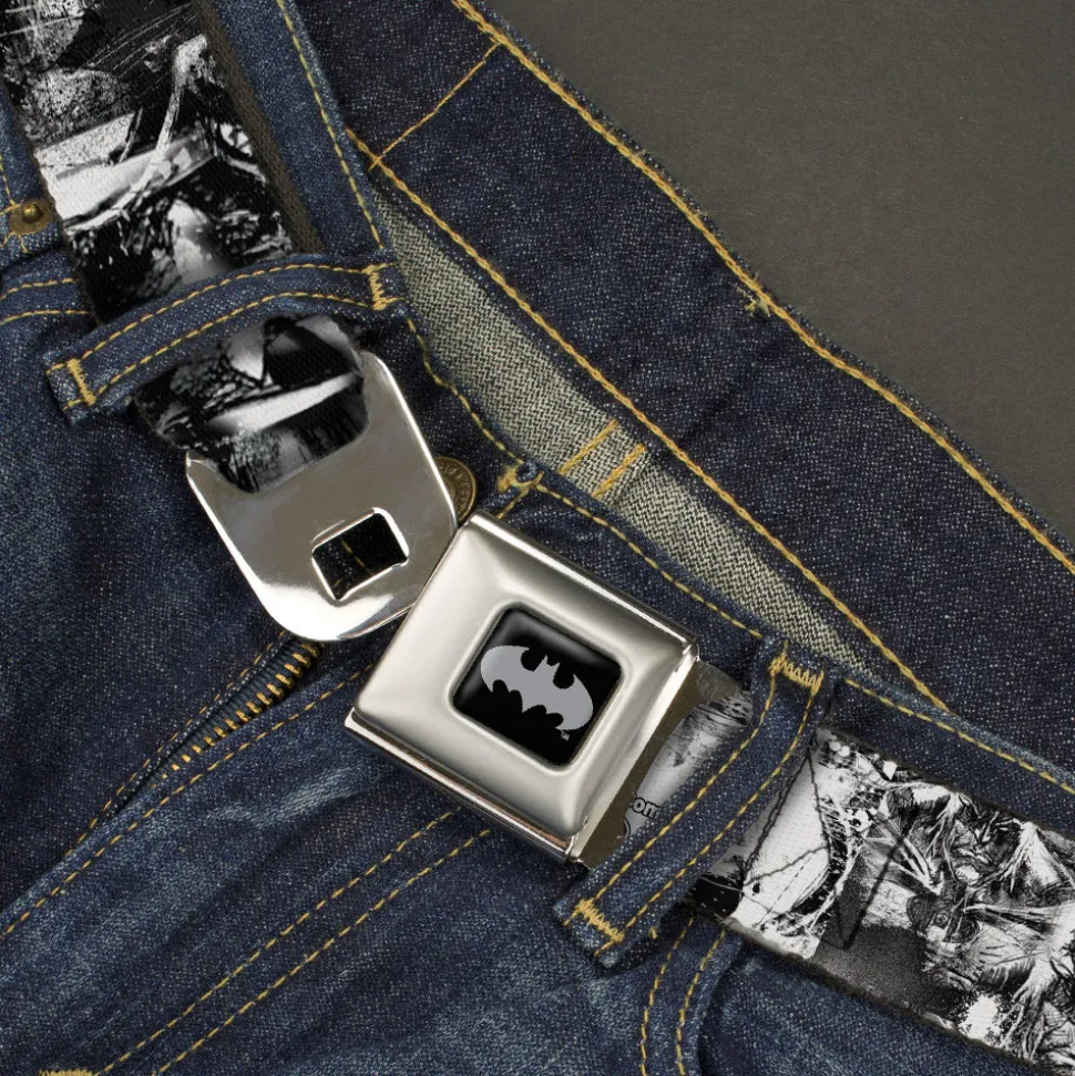 Batman Black Silver Seatbelt Belt – Batman Poses & Bat Shield Sketch White/Black Webbing