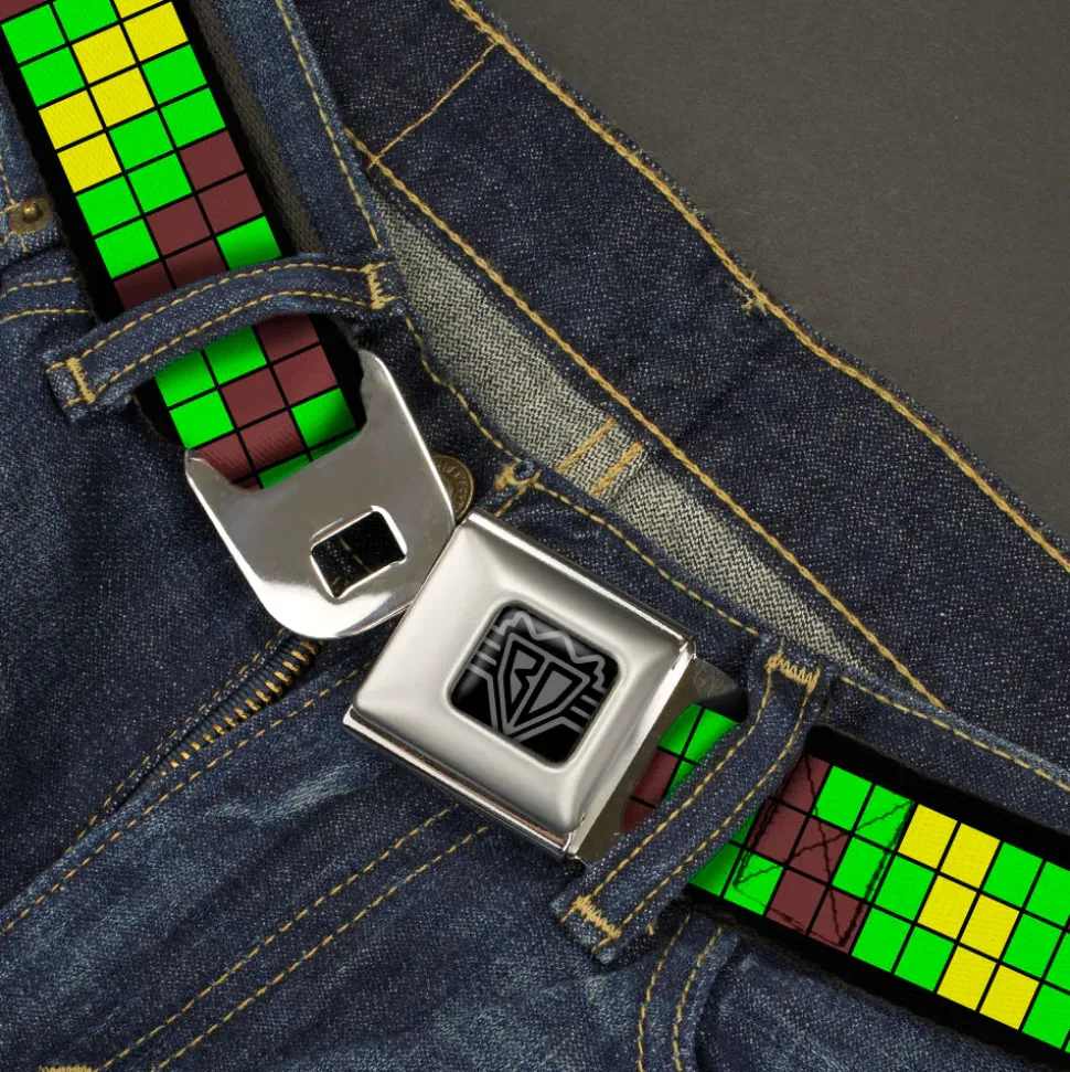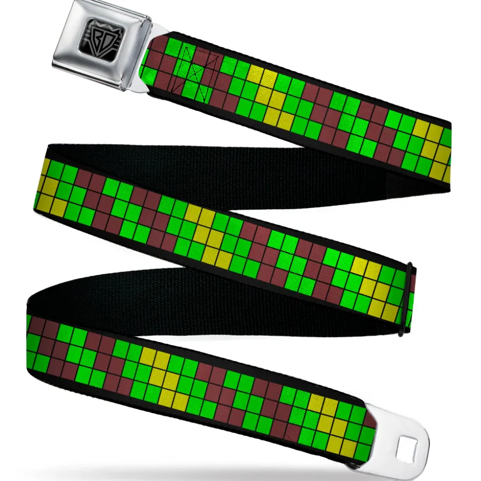 BD Wings Logo CLOSE-UP Black/Silver Seatbelt Belt – 8-Bit Pixel Step Stripe Black/Brown/Green/Yellow Webbing