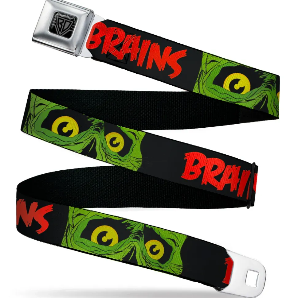 BD Wings Logo CLOSE-UP Black/Silver Seatbelt Belt – BRAINS/Zombie Face CLOSE-UP Black/Red/Green/Yellow Webbing