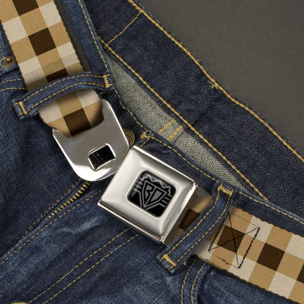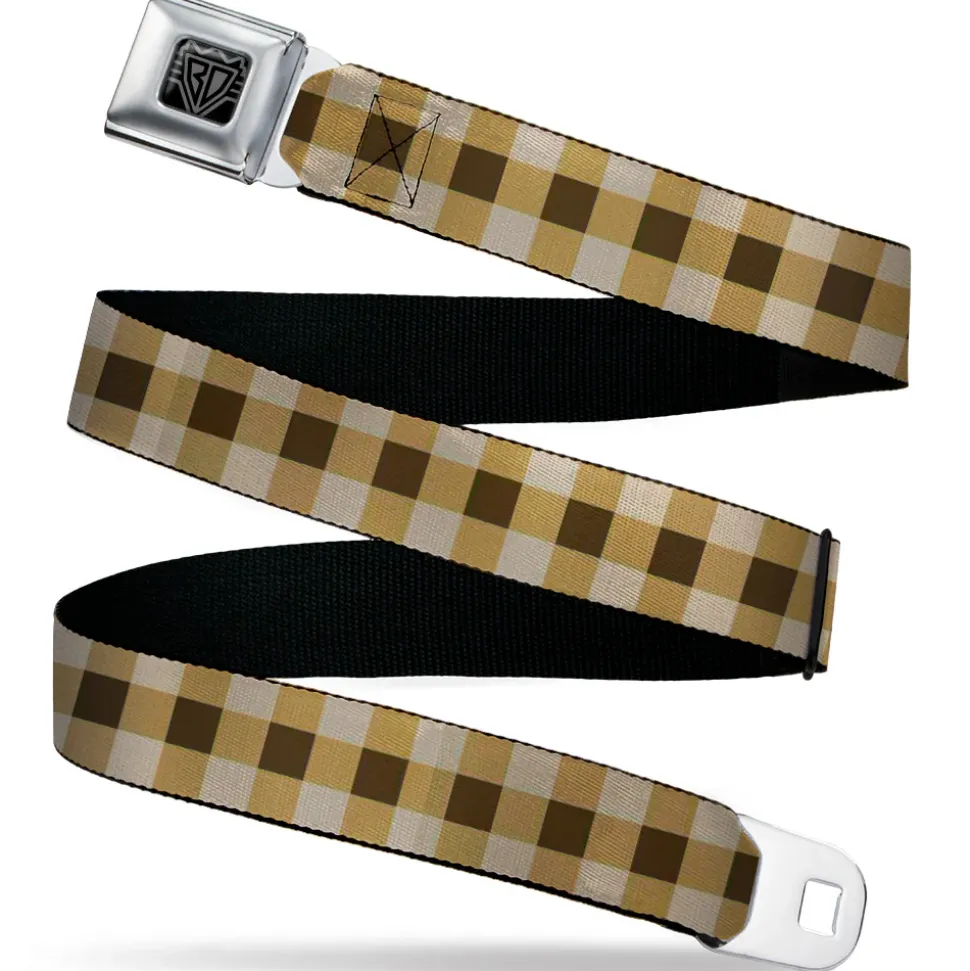 BD Wings Logo CLOSE-UP Black/Silver Seatbelt Belt – Buffalo Plaid Tans/Brown Webbing