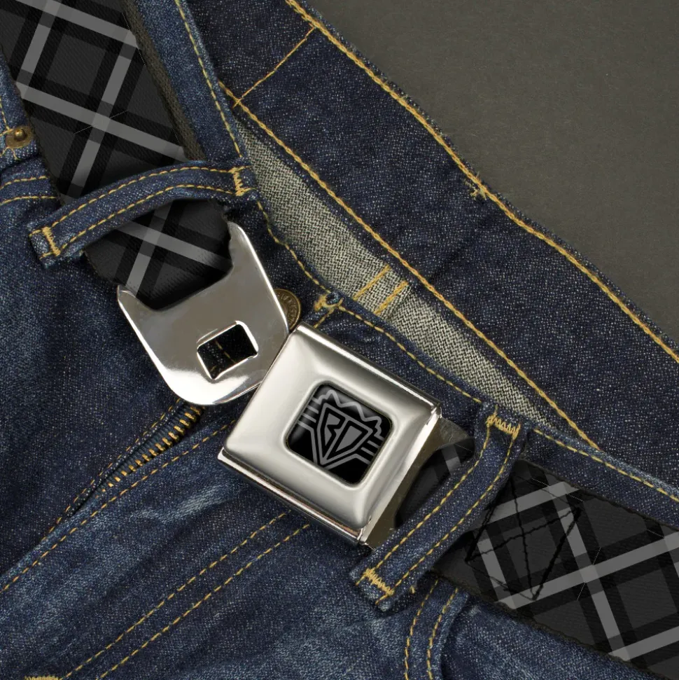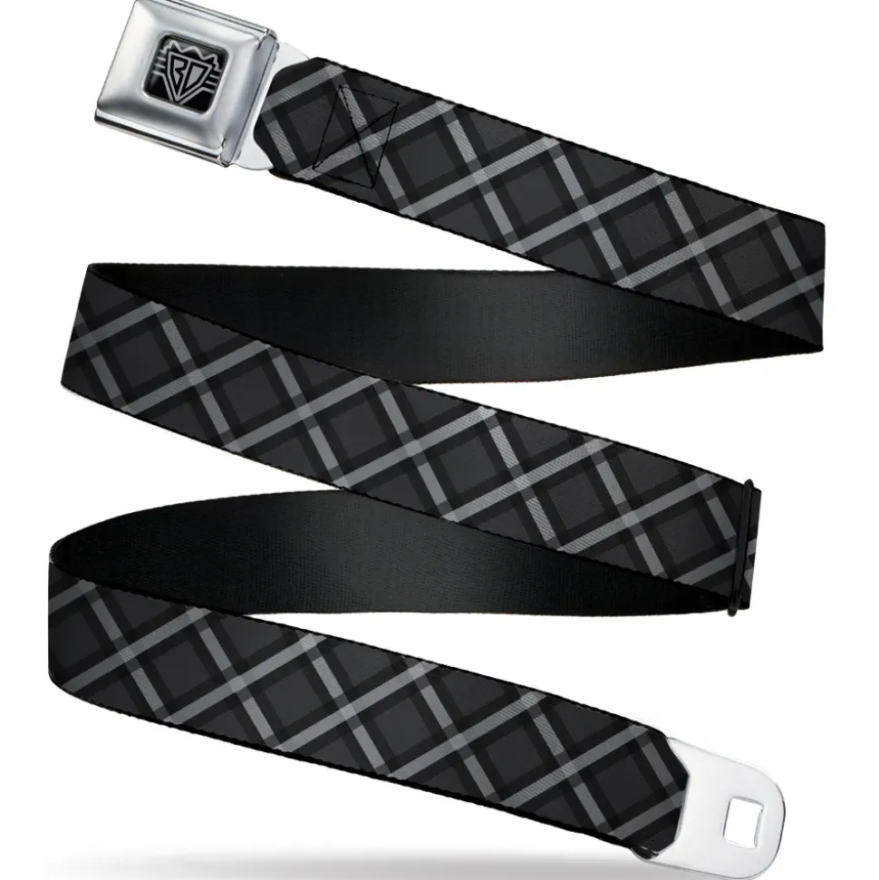BD Wings Logo CLOSE-UP Black/Silver Seatbelt Belt – Buffalo Plaid X Charcoal/Black/Gray Webbing