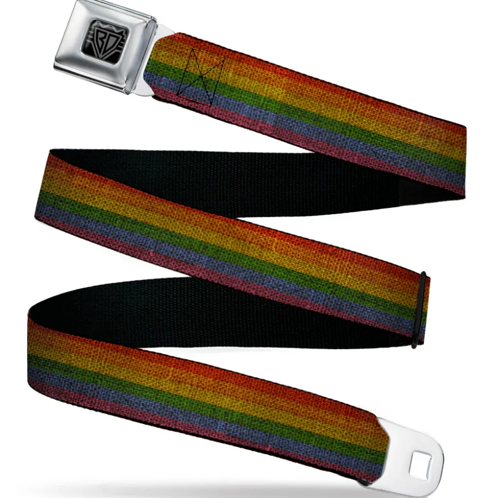 BD Wings Logo CLOSE-UP Black/Silver Seatbelt Belt – Burlap Texture Rainbow Webbing