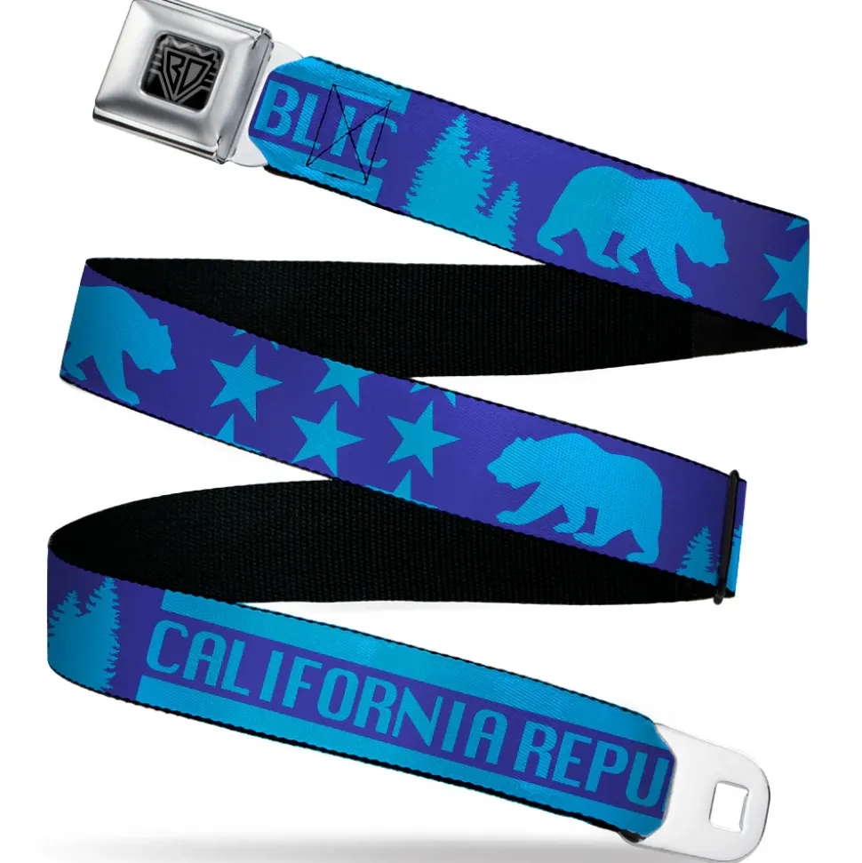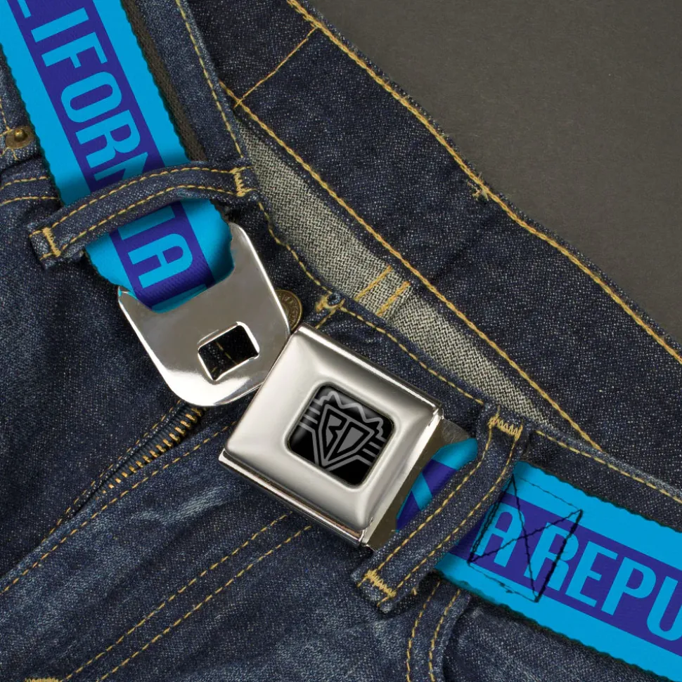 BD Wings Logo CLOSE-UP Black/Silver Seatbelt Belt – CALIFORNIA REPUBLIC/Bear/Stars Silhouette Blues Webbing