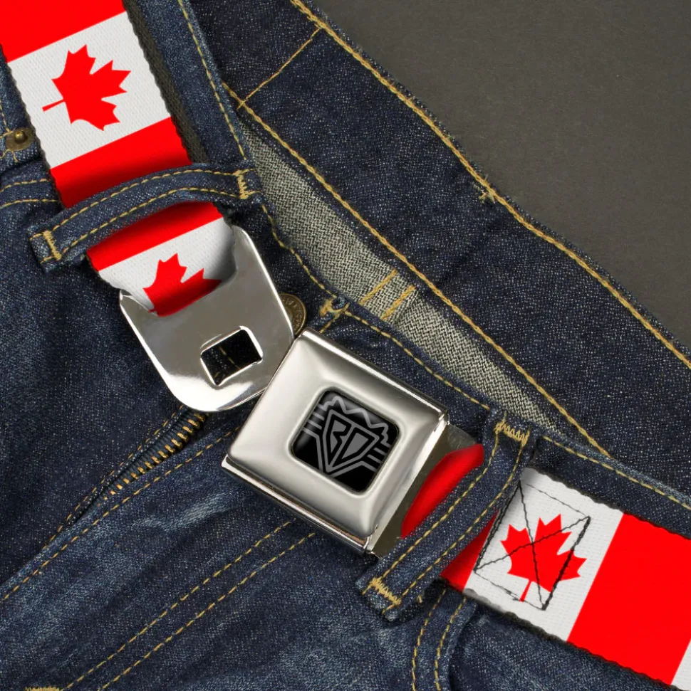 BD Wings Logo CLOSE-UP Black/Silver Seatbelt Belt – Canada Flag Continuous Webbing