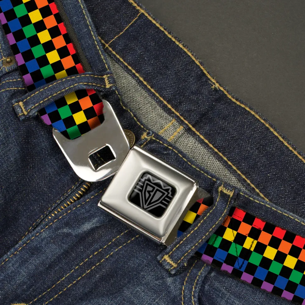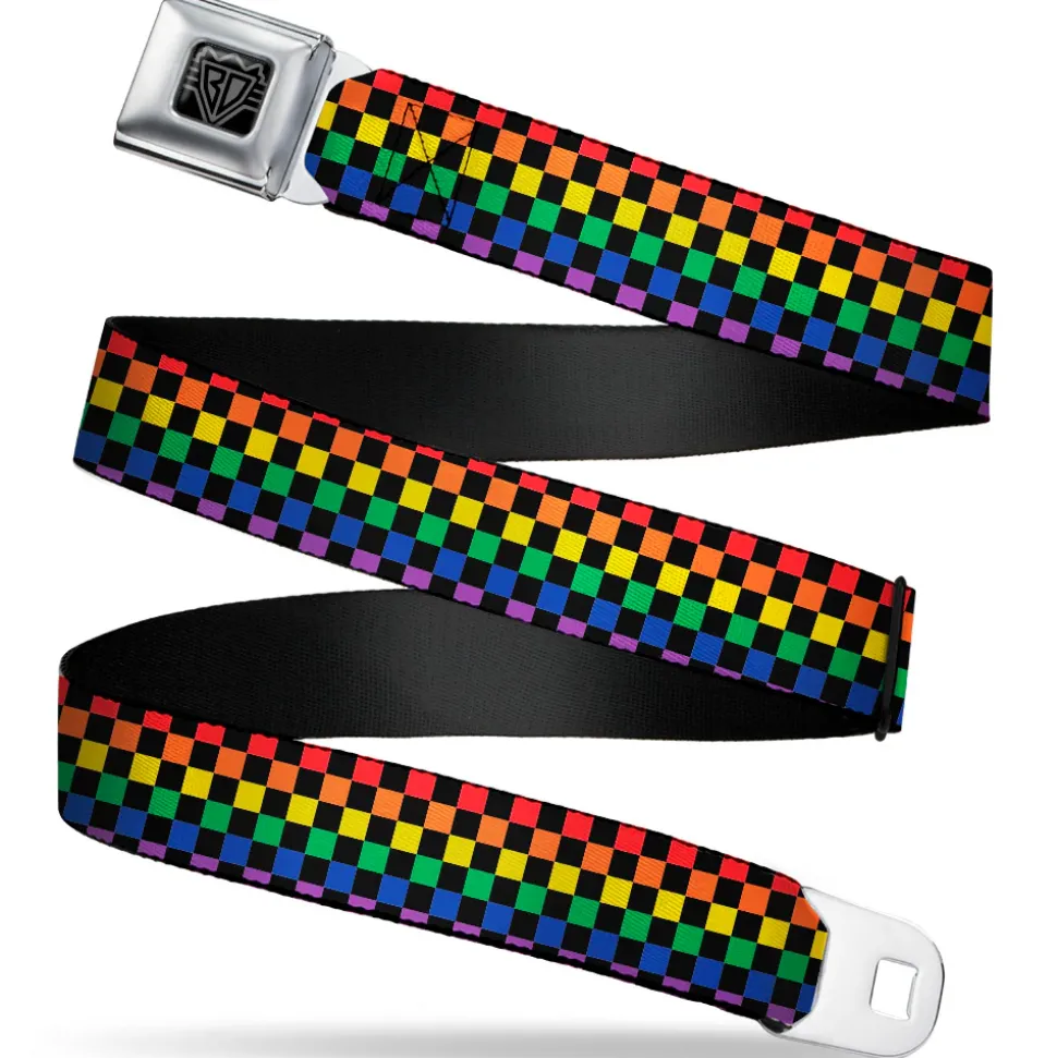 BD Wings Logo CLOSE-UP Black/Silver Seatbelt Belt – Checker Black/Rainbow Multi Color Webbing