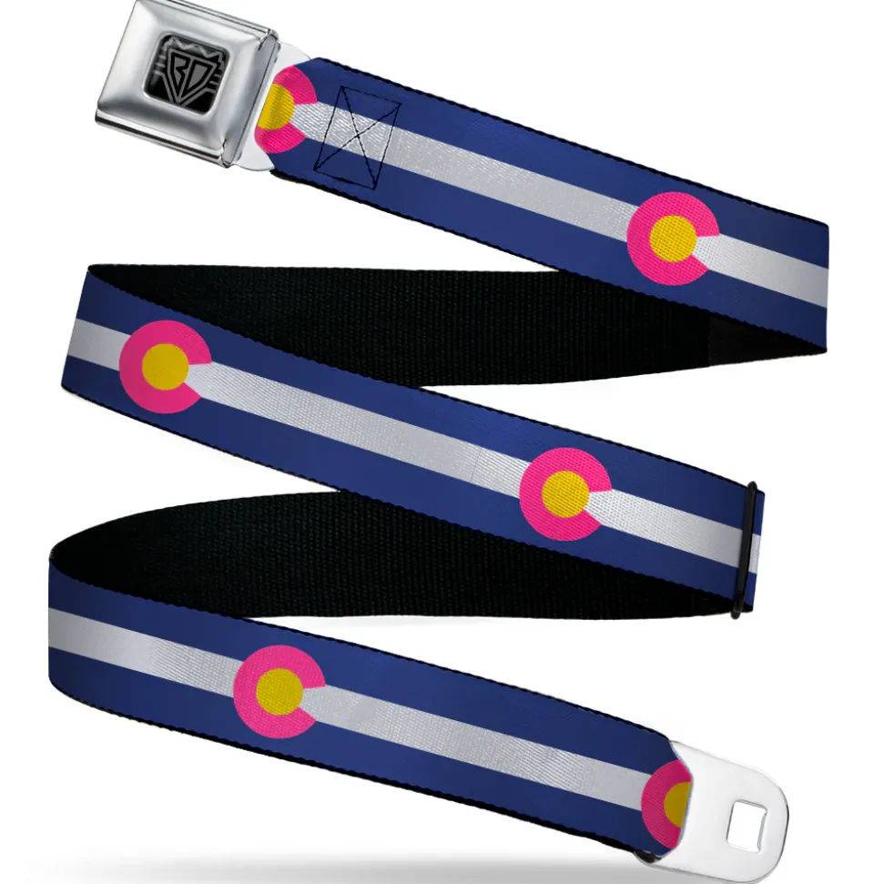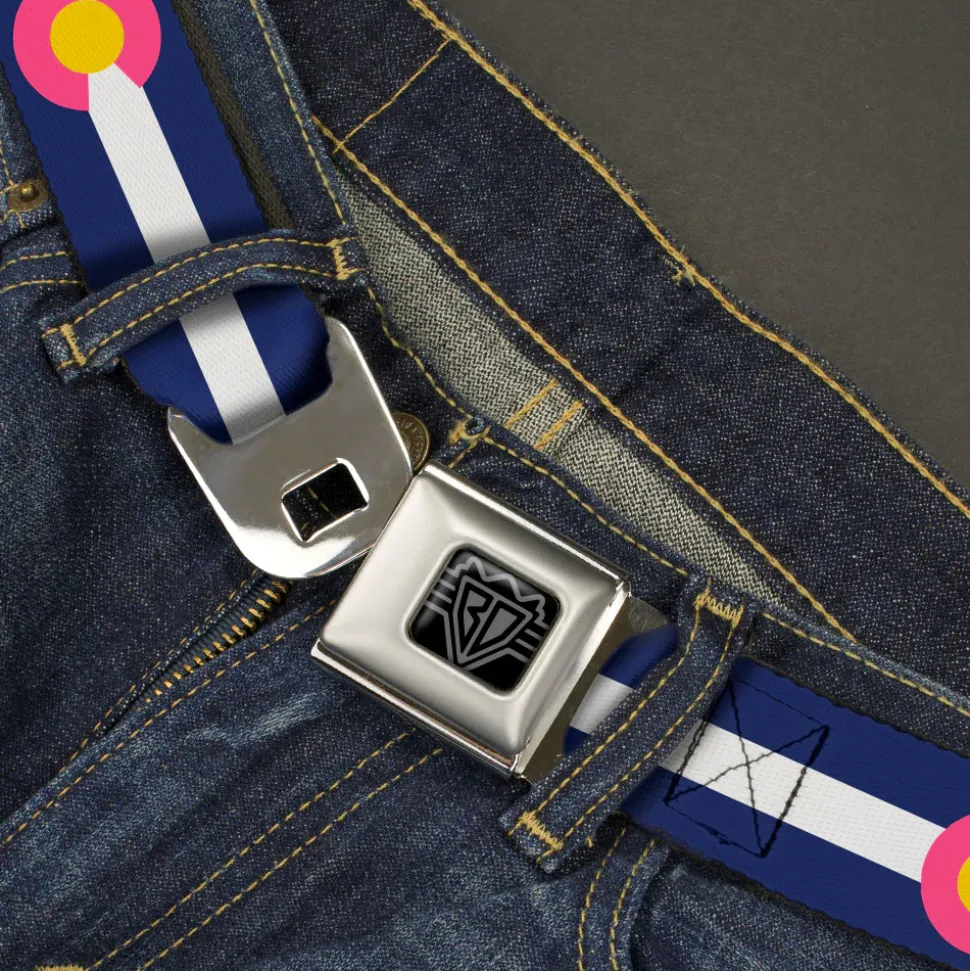 BD Wings Logo CLOSE-UP Black/Silver Seatbelt Belt – Colorado Flags6 Repeat Blue/White/Pink/Yellow Webbing