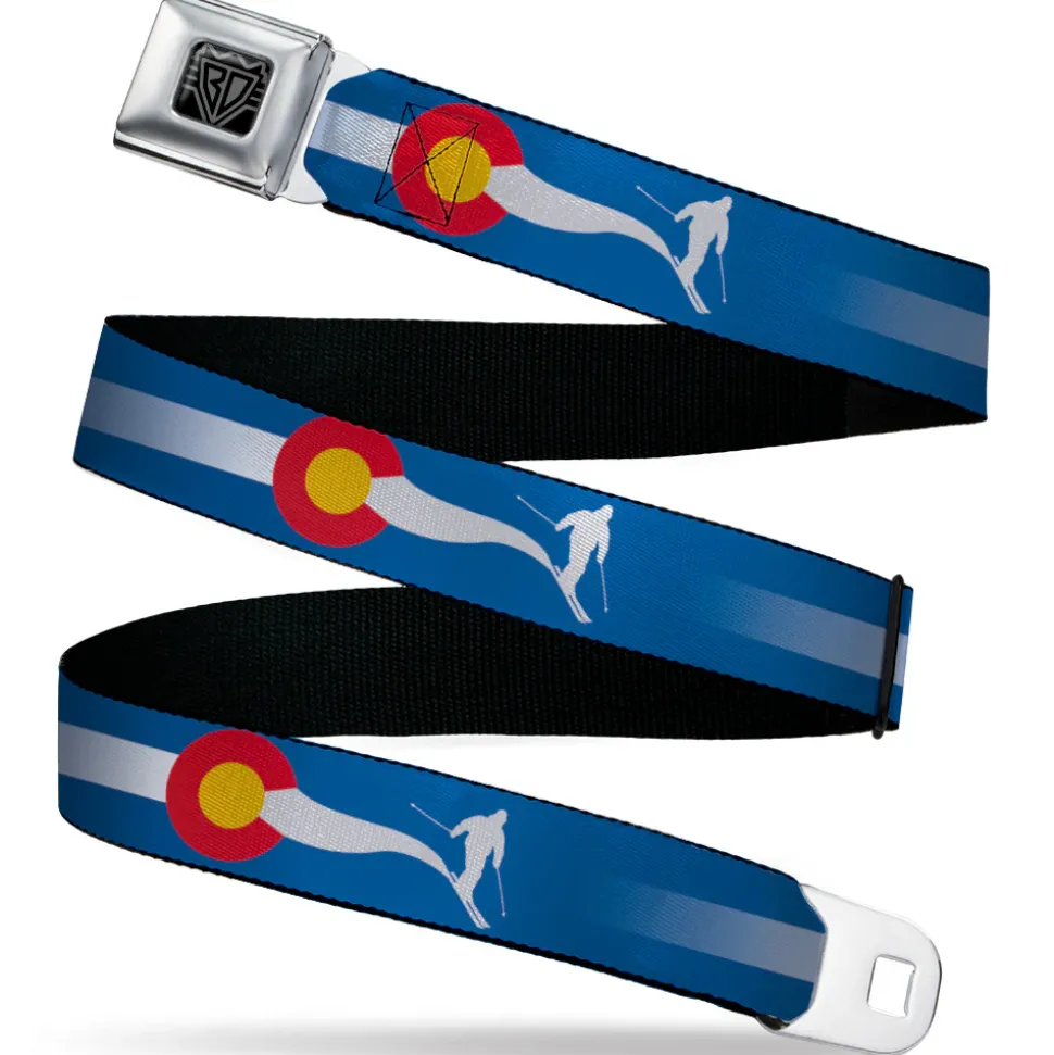 BD Wings Logo CLOSE-UP Black/Silver Seatbelt Belt – Colorado Skier2 Blue/White/Red/Yellow Webbing
