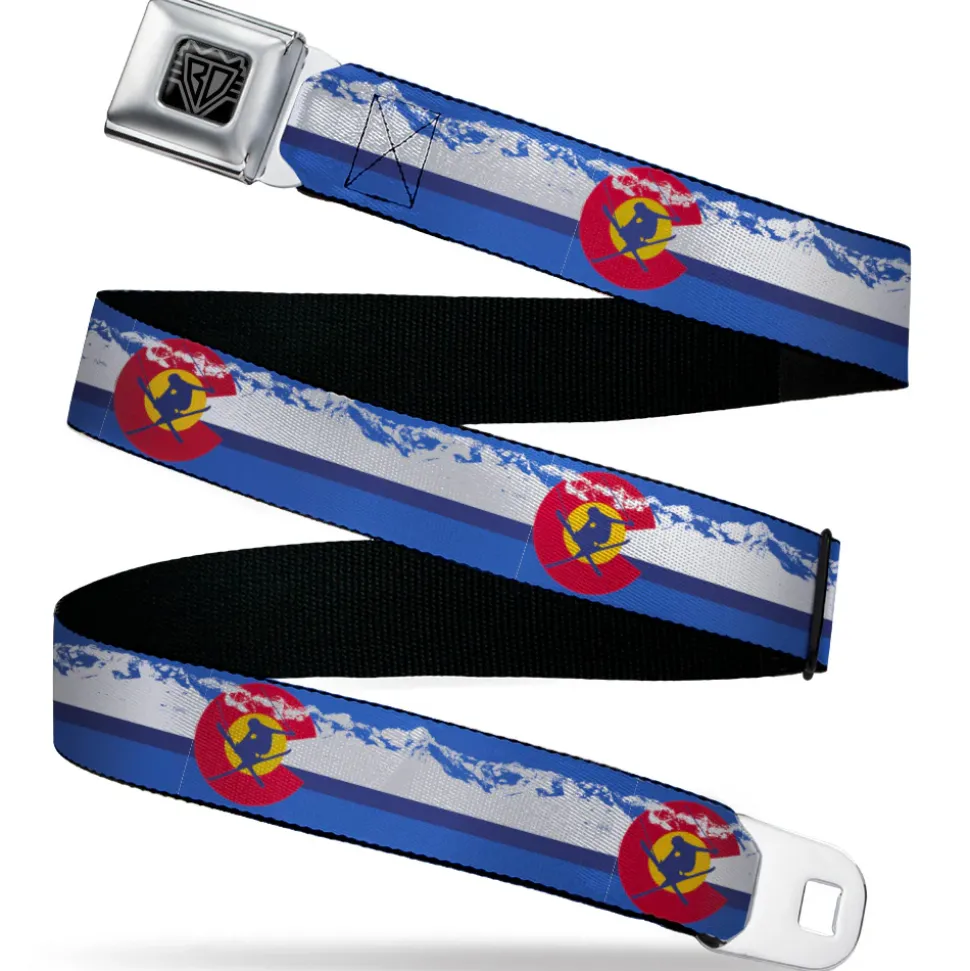 BD Wings Logo CLOSE-UP Black/Silver Seatbelt Belt – Colorado Skier4/Mountains Blues/White/Red/Yellow Webbing