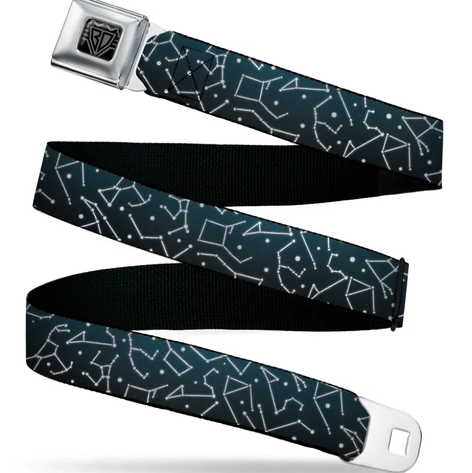 BD Wings Logo CLOSE-UP Black/Silver Seatbelt Belt – Constellations Scattered Midnight Blue/White Webbing