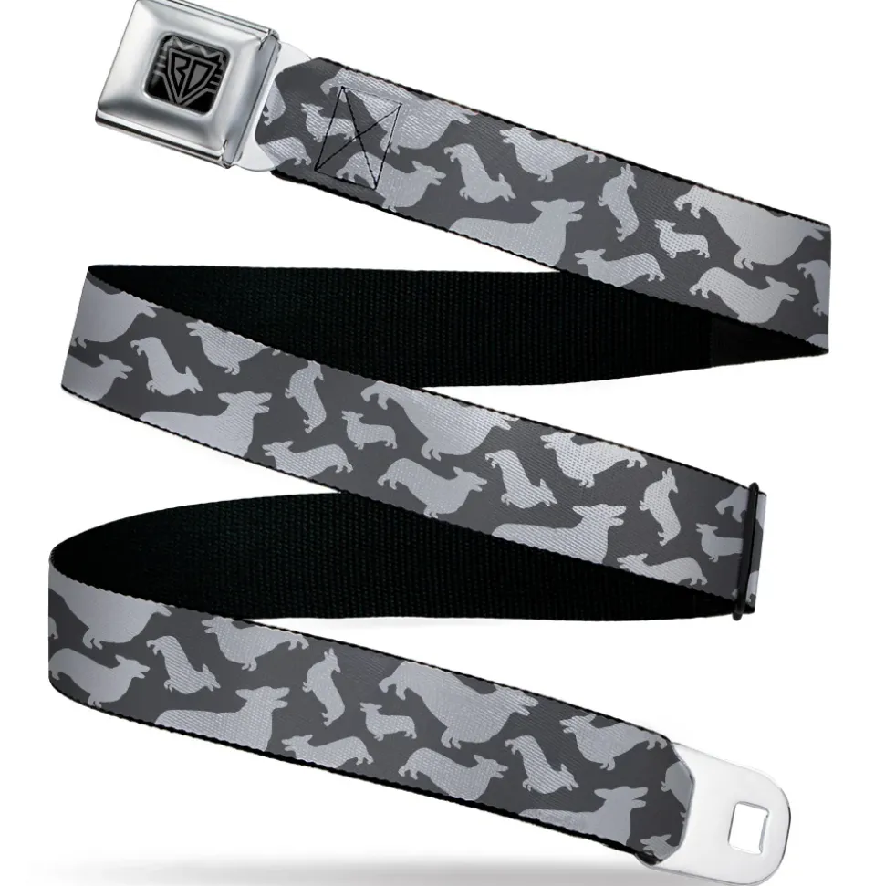 BD Wings Logo CLOSE-UP Black/Silver Seatbelt Belt – Corgi Silhouette Poses Grays Webbing