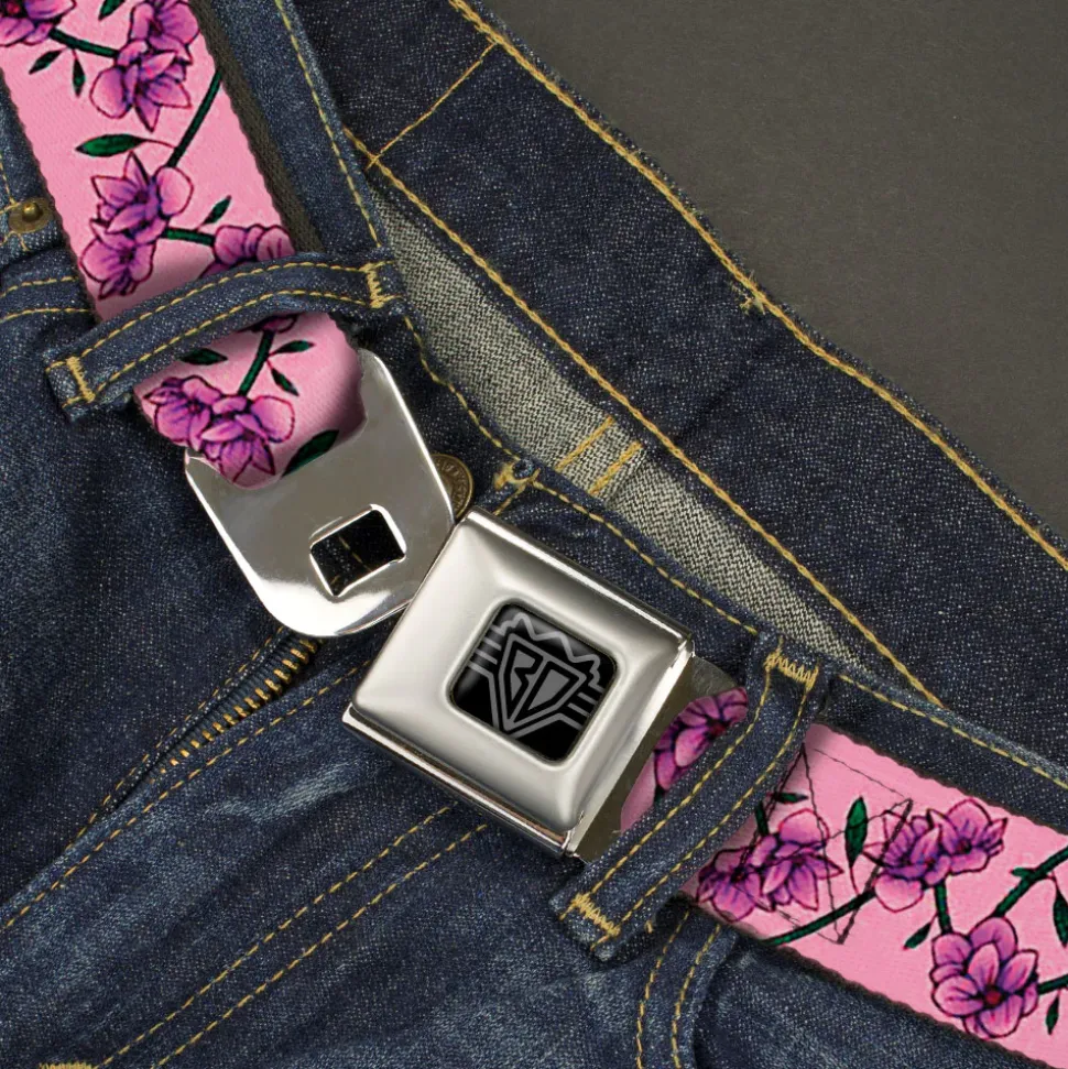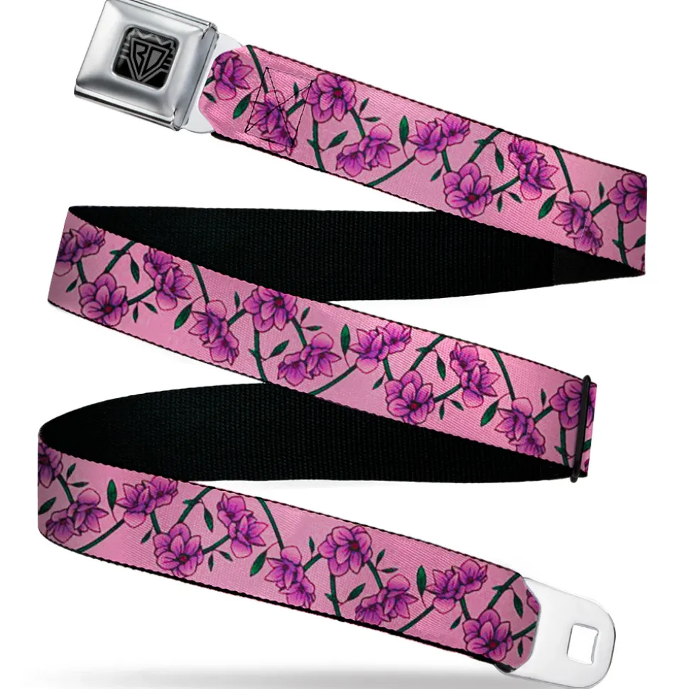 BD Wings Logo CLOSE-UP Black/Silver Seatbelt Belt – Floral Chain Pink Webbing