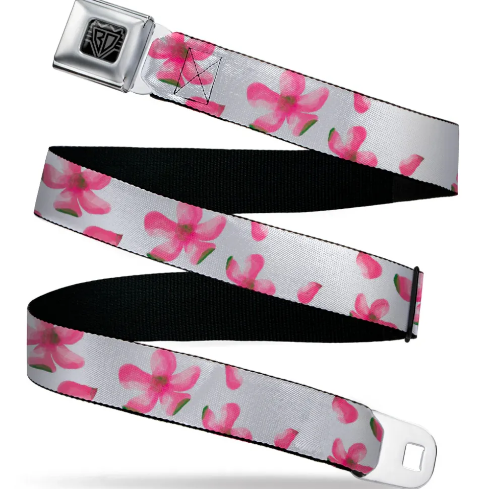 BD Wings Logo CLOSE-UP Black/Silver Seatbelt Belt – Flowers/Petals Scattered White/Pinks Webbing
