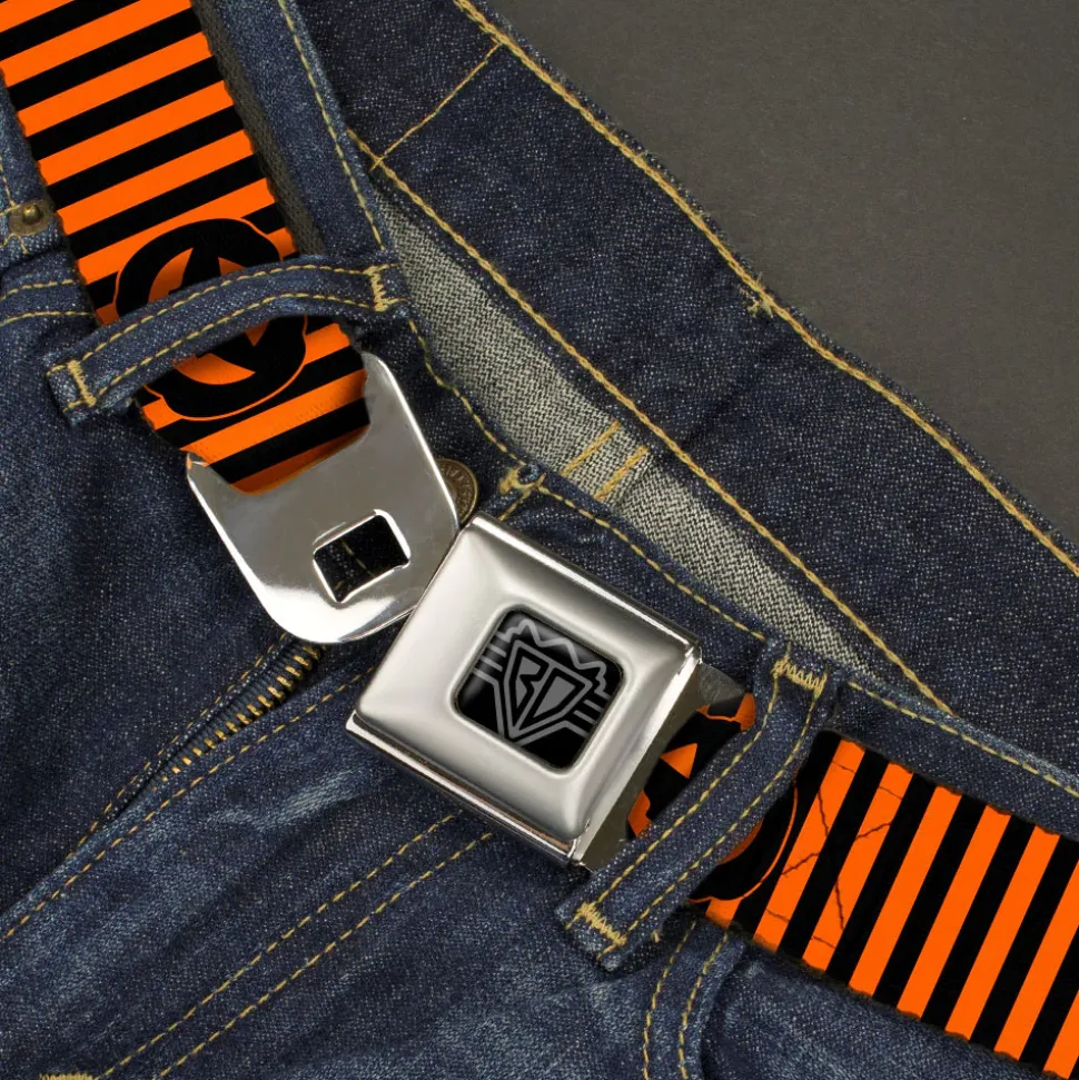 BD Wings Logo CLOSE-UP Black/Silver Seatbelt Belt – Jack-o'-Lantern Pumpkin Stripe Orange/Black Webbing