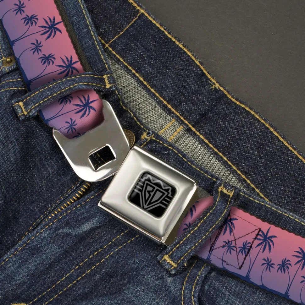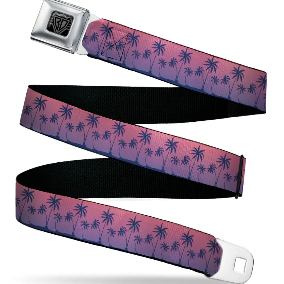 BD Wings Logo CLOSE-UP Black/Silver Seatbelt Belt – Palm Treeline Silhouette Pink Fade/Purple Webbing