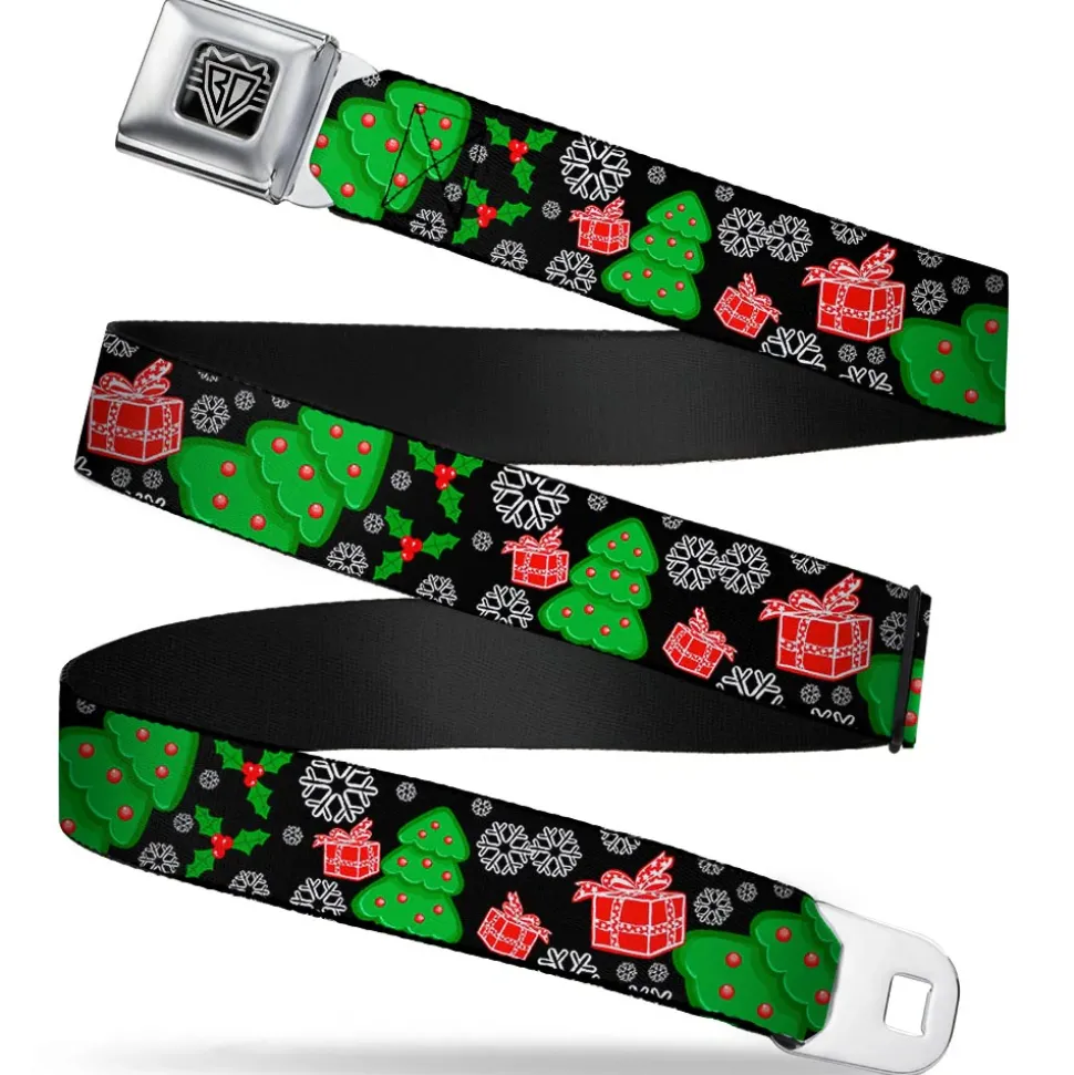 BD Wings Logo CLOSE-UP Full Color Black Silver Seatbelt Belt – Christmas Collage Black/White/Green/Red Webbing