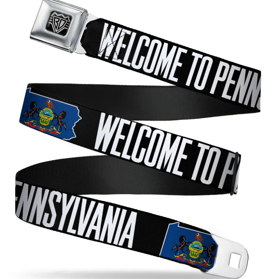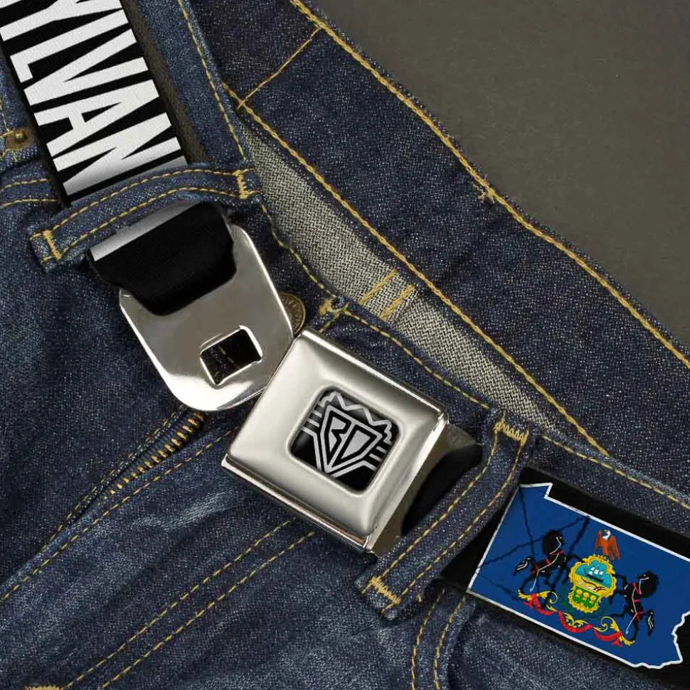 BD Wings Logo CLOSE-UP Full Color Black Silver Seatbelt Belt – Pennsylvania Flag Silhouette WELCOME TO PENNSYLVANIA Webbing