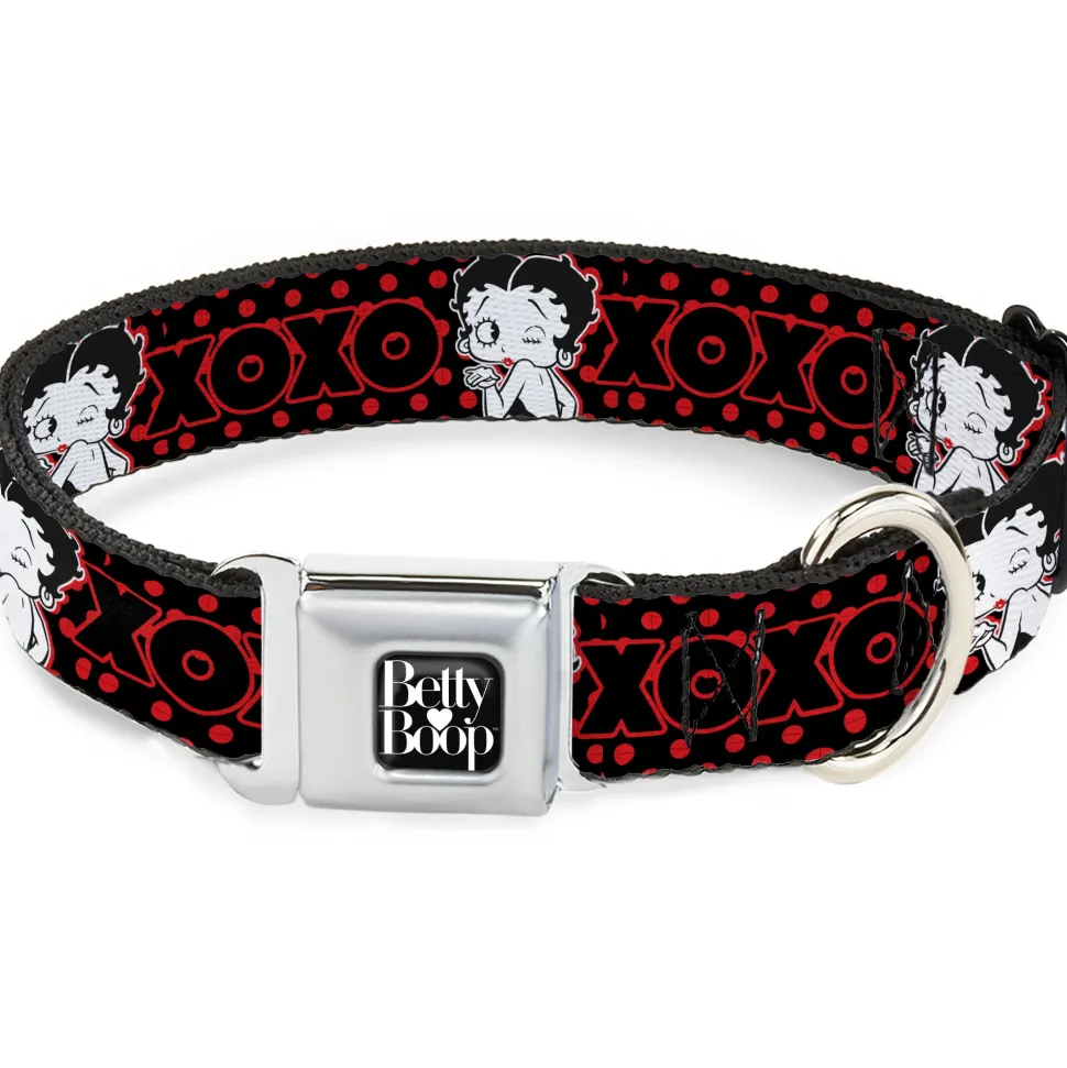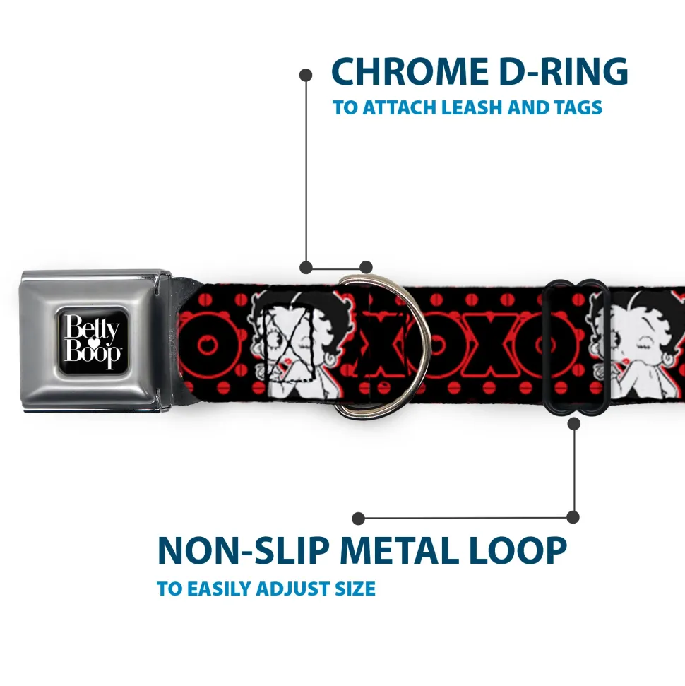 BETTY BOOP Text Heart Logo Full Color Black/White Seatbelt Buckle Collar – Betty Boop Winking Kiss Pose with XOXO Text Polka Dot Black/Red/White