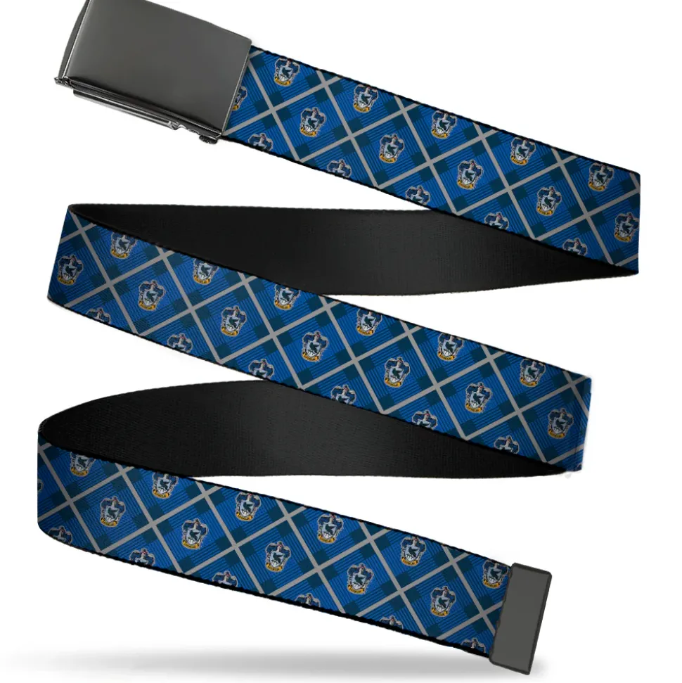 Black Buckle Web Belt – Harry Potter Ravenclaw Crest Plaid Blues/Gray Webbing