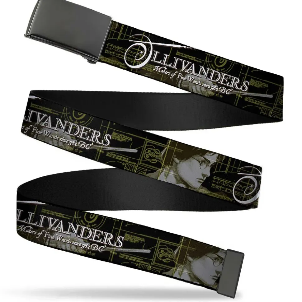 Black Buckle Web Belt – Harry Potter Wand Pose/OLLIVANDERS-MAKERS OF FINE WANDS Black/Browns/Golds Webbing