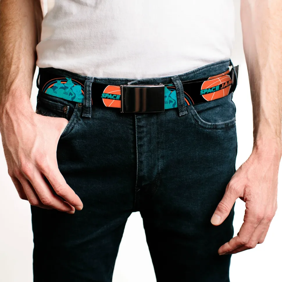 Black Buckle Web Belt - SPACE JAM 2 Basketball Logo and Tune Squad 3-Character Group Pose Black/Blues/Orange Webbing