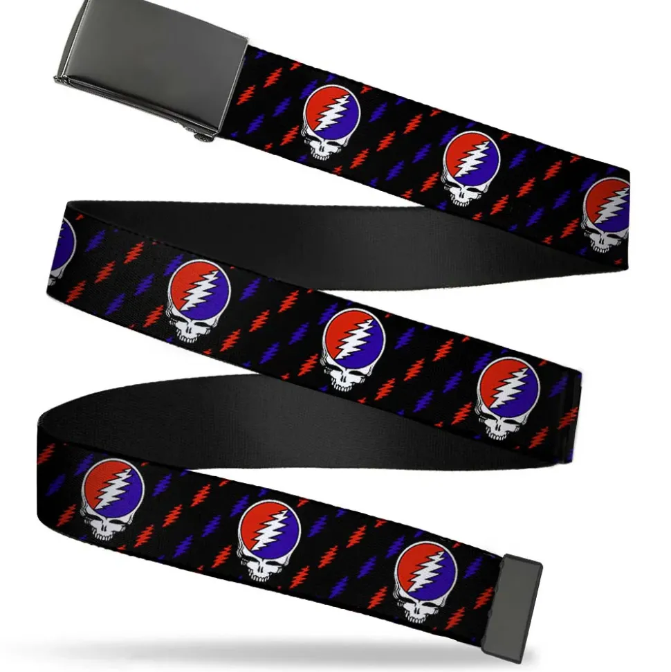 This unique web belt features a solid plain military-style clasp Buckle. It features beautiful artwork which is dyed into the fabric to ensure it looks great for years. This belt is available in 1.0″, 1.25″, and 1.5″ widths. 1.0″ wide belt is sized for children and adults with pants size 30 or lower. 1.25″ and 1.5″ wide belts are sized for adults, fitting up to pant size 42. This web belt is made from high-density nylon and steel. 1.5″ wide belt also has a bottle opener built into the back of the buckle! This product is Made in the USA by Buckle-Down Inc. and is officially licensed by Grateful Dead.