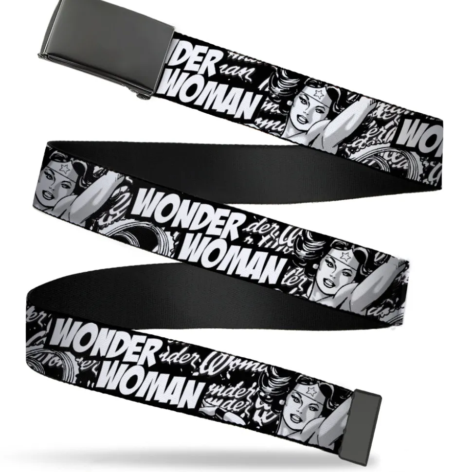 Black Buckle Web Belt – WONDER WOMAN Action Pose/Text Collage Black/White/Grays Webbing