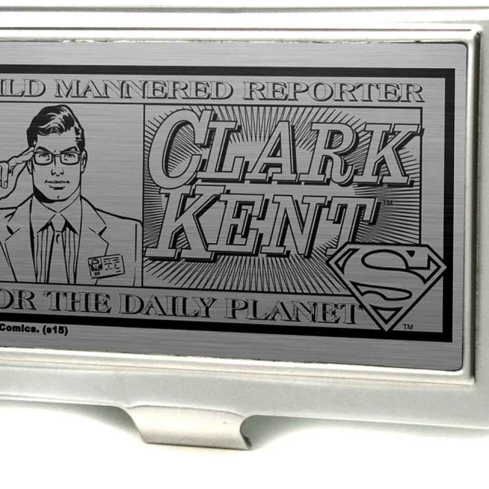 Business Card Holder - SMALL - CLARK KENT Pose MILD MANNERED REPORTER FOR THE DAILY PLANET Brushed Silver Black
