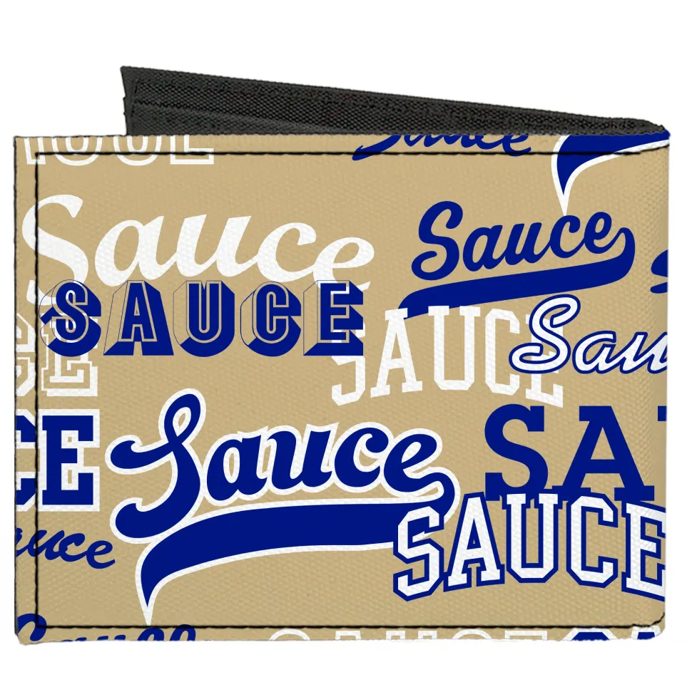 Canvas Bi-Fold Wallet – SAUCE Typography Collage Tan/White/Blue