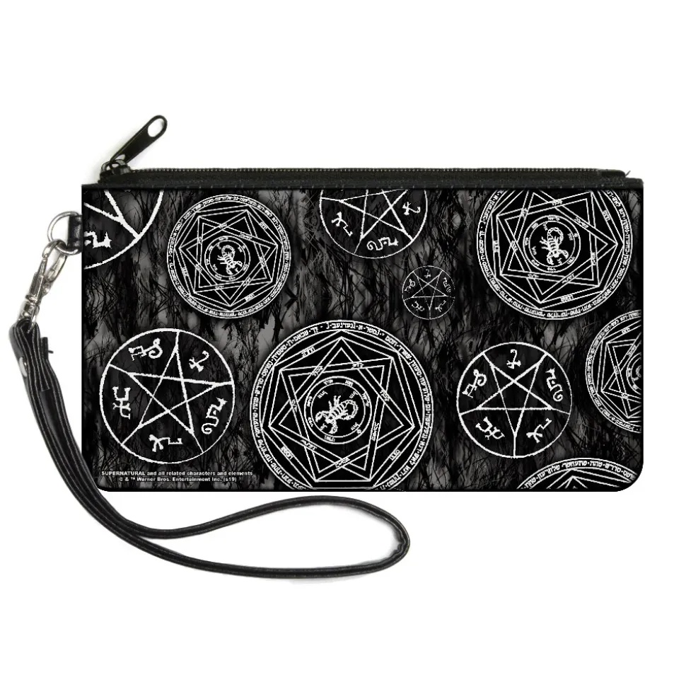 This is your classic “clutch” wallet, great for when you don’t want to carry around a bulky purse. It’s made from high-density woven nylon, and measures 8.0″x5.0″, with 4 card slots, a billfold, and a pouch. It zips smoothly shut, and has a detachable wrist strap for easy carrying. This product is Made in USA by Buckle-Down, Inc. and Officially Licensed by Supernatural.