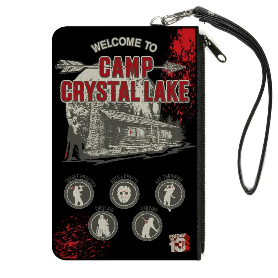 Canvas Zipper Wallet – SMALL – Friday the 13th WELCOME TO CAMP CRYSTAL LAKE Jason Cabin Badges Black Grays Reds