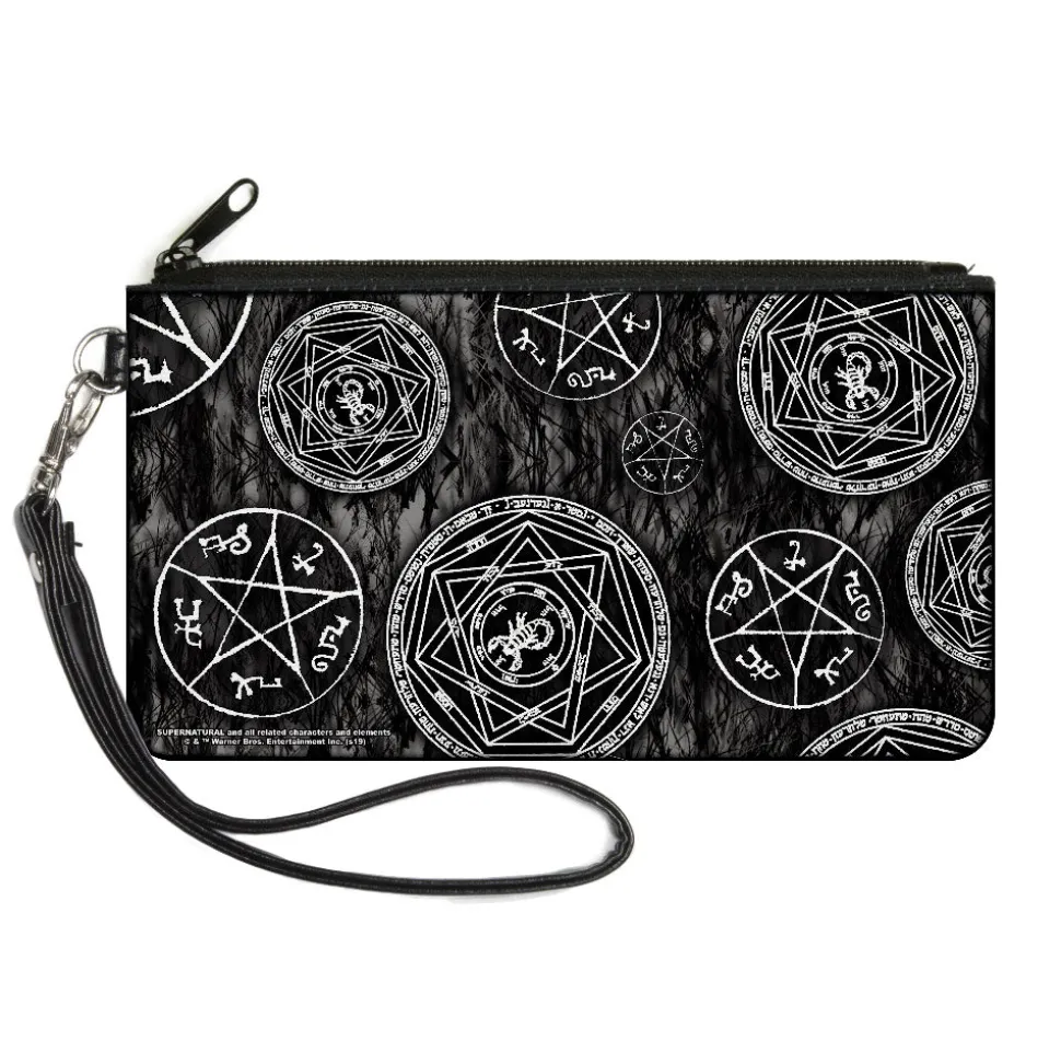 This is your classic “clutch” wallet, great for when you don’t want to carry around a bulky purse. It’s made from high-density woven polyester, and measures 6.5″x3.5″, with one pouch, a smooth zipper, and a detachable wrist strap for easy carrying. This product is Made in USA by Buckle-Down, Inc. and Officially Licensed by Supernatural.