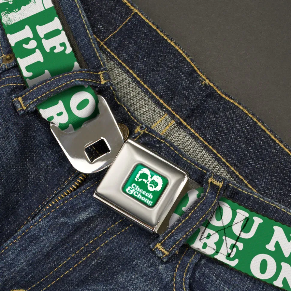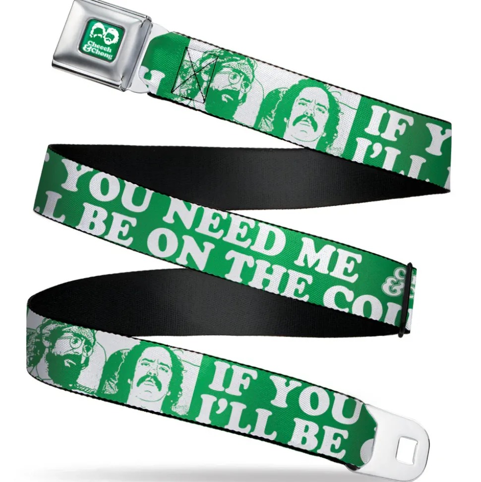 CHEECH & CHONG Faces Silhouette Full Color Green/White Seatbelt Belt – CHEECH & CHONG Pose IF YOU NEED ME I'LL BE ON THE COUCH Green/White Webbing