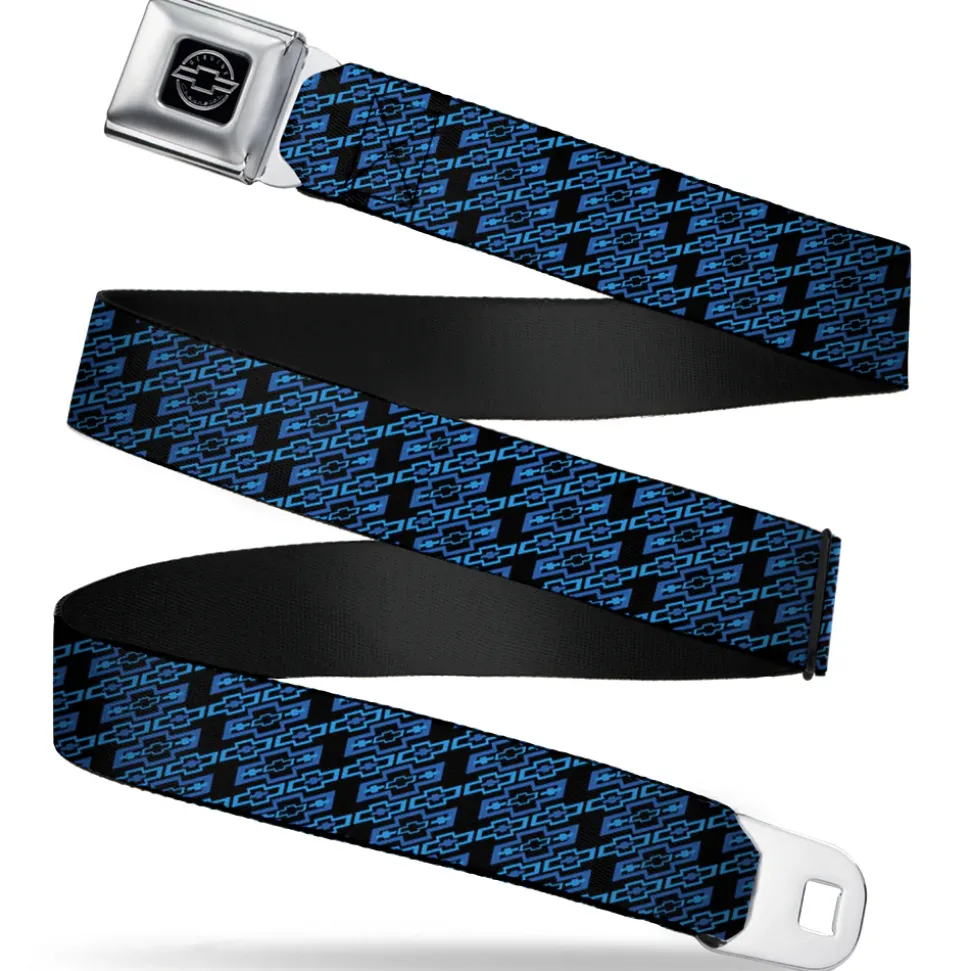 Chevy Seatbelt Belt – Diagonal Retro Chevy Bowtie Monogram Black/Blues Webbing