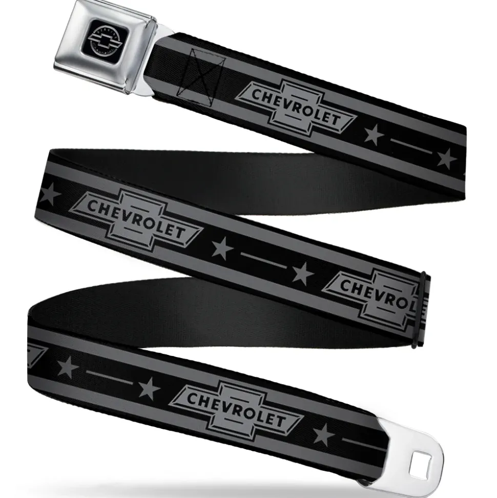 Chevy Seatbelt Belt – Vintage CHEVROLET Bowtie/Stars Stripe Black/Grays (1934 logo) Webbing