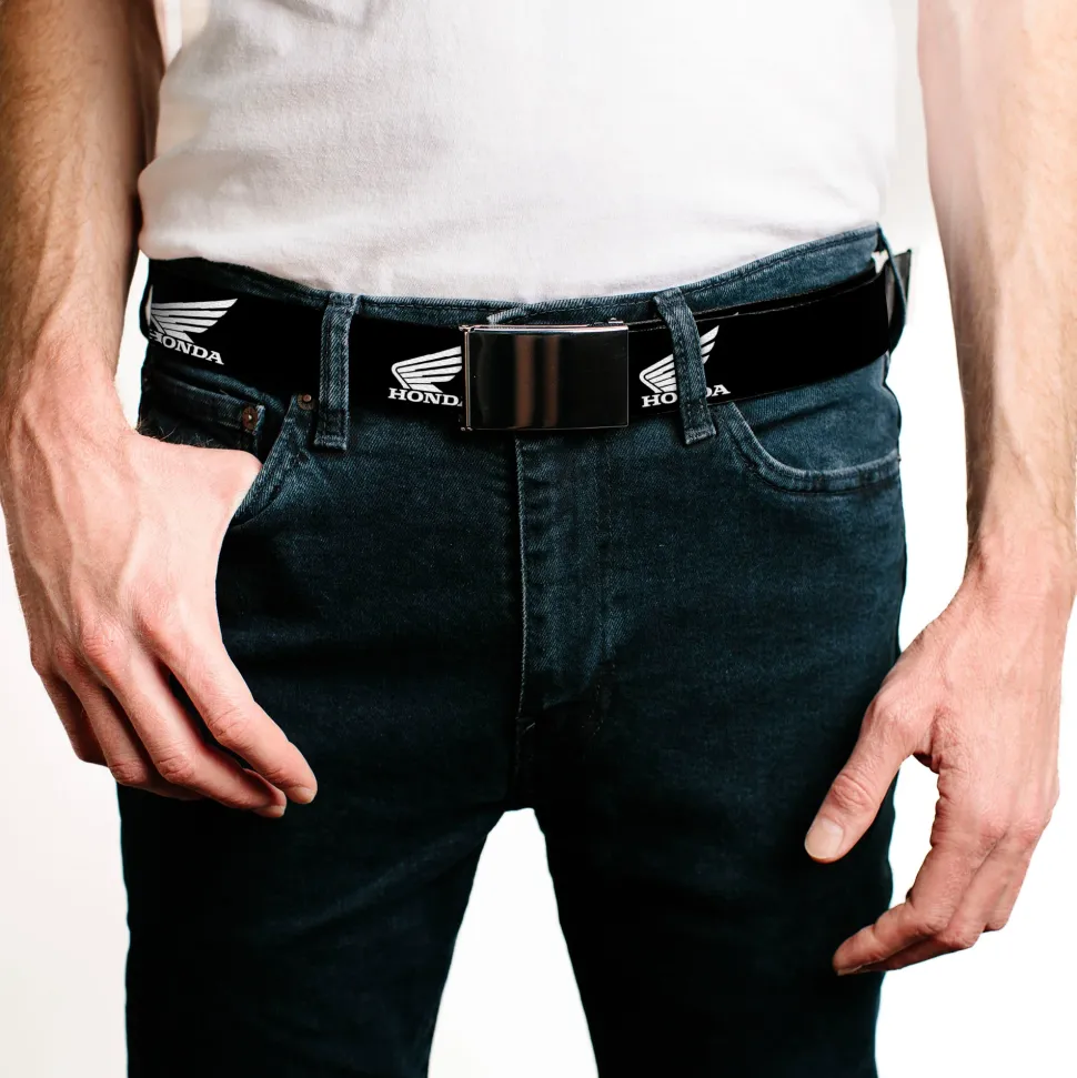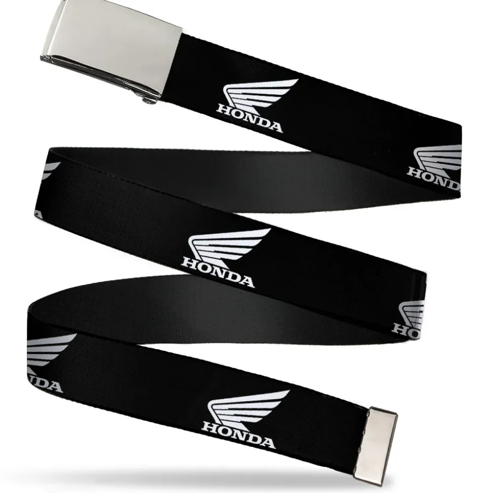 This unique web belt features a solid plain military-style clasp Buckle. It features beautiful artwork which is dyed into the fabric to ensure it looks great for years. This belt is available in 1.0″, 1.25″, and 1.5″ widths. 1.0″ wide belt is sized for children and adults with pants size 30 or lower. 1.25″ and 1.5″ wide belts are sized for adults, fitting up to pant size 42. This web belt is made from high-density nylon and steel. 1.5″ wide belt also has a bottle opener built into the back of the buckle! This product is Made in the USA by Buckle-Down Inc. and is officially licensed by Honda Motorsports.