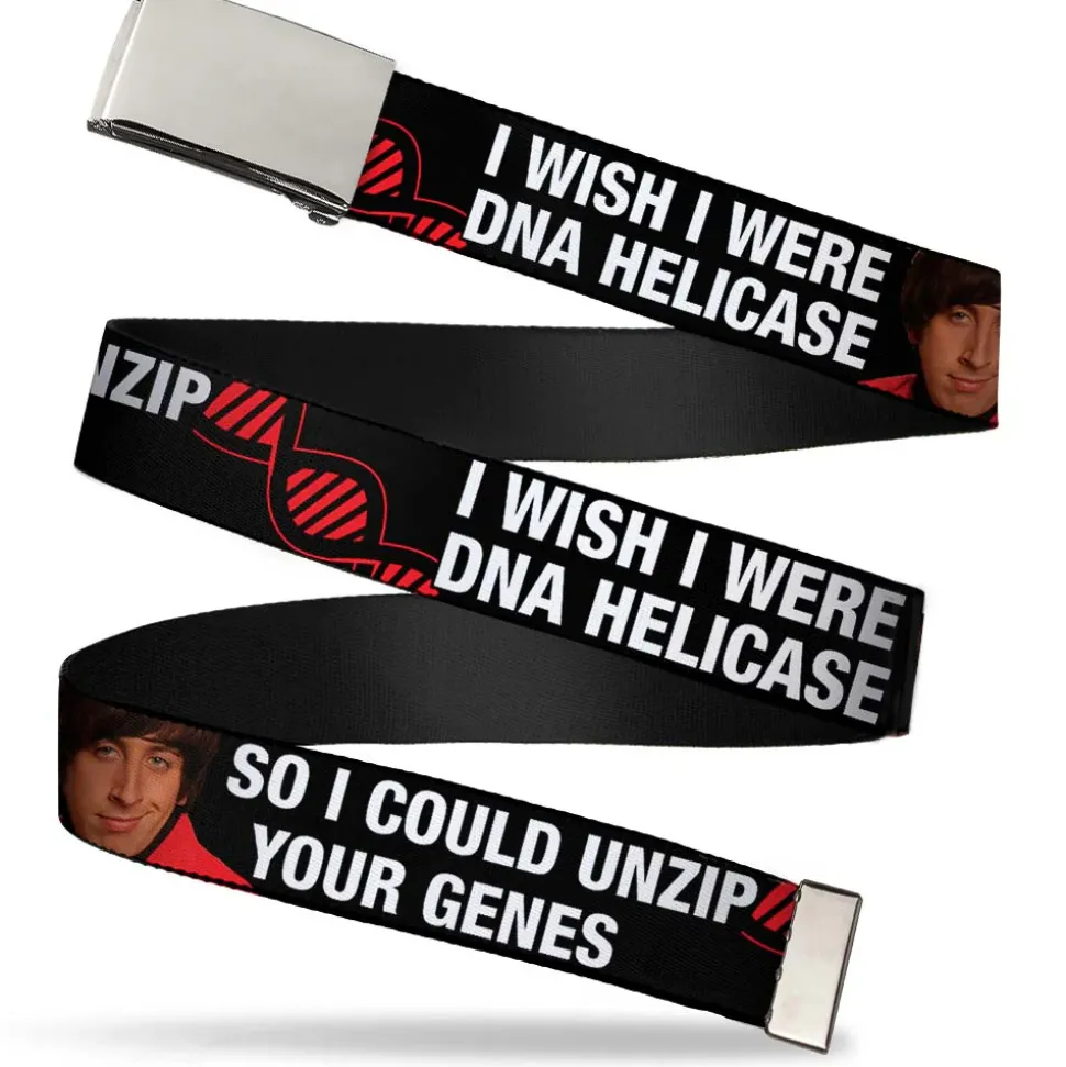Chrome Buckle Web Belt – Howard/Double Helix I WISH I WERE DNA HELICASE Black/White/Red Webbing